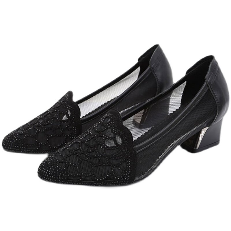 中跟粗跟妈妈时装 真皮高跟凉鞋 女2026新款 镂空水钻女鞋 鞋