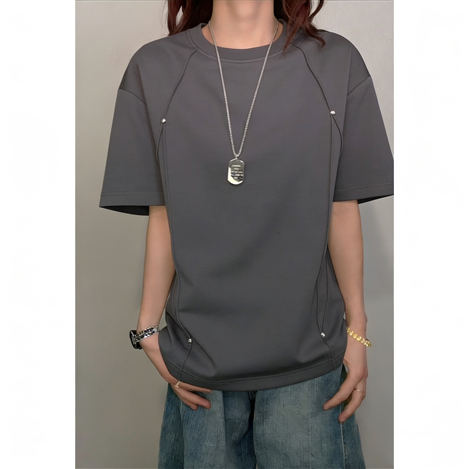 DT2605 P16 T恤男 白色麂皮绒铆钉显瘦短袖由