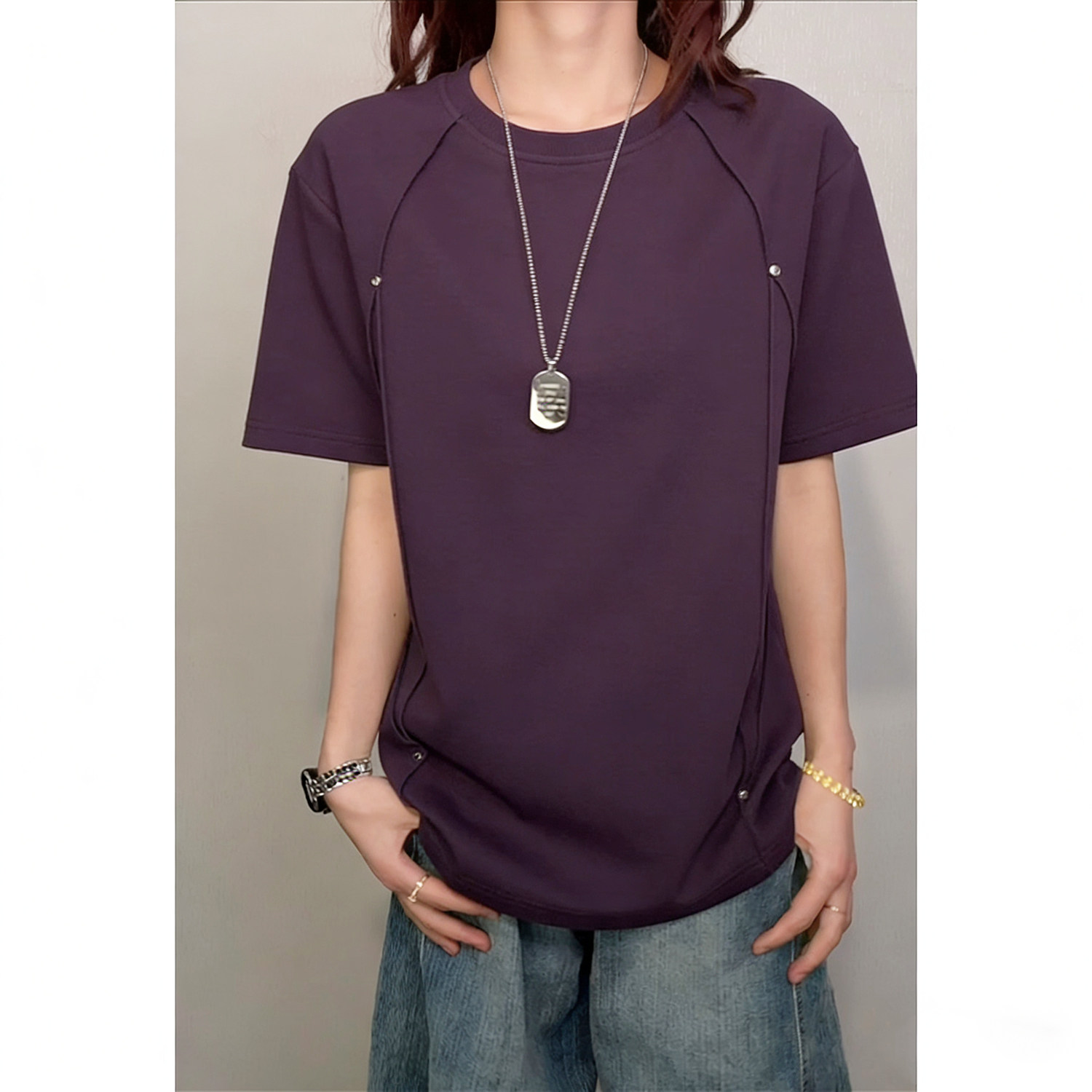 紫色圆领上衣女 MosesQueen魔西女王显身材掐腰正肩T恤女2025夏季