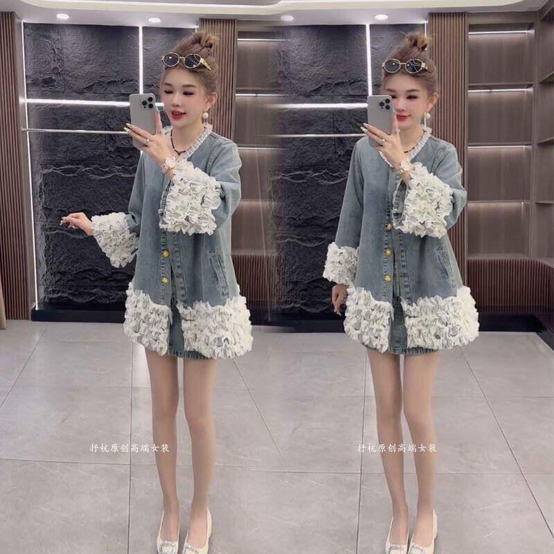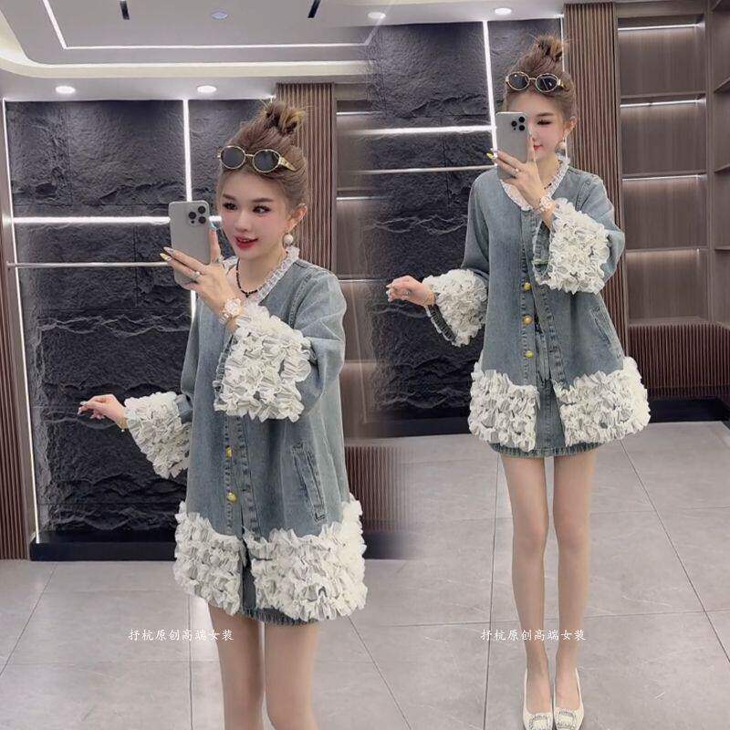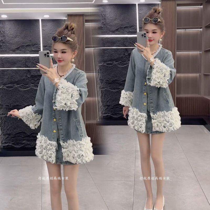 时尚 女2026春新款 韩版 牛仔重工轻奢高级感拼接外套短裙两件套 套装