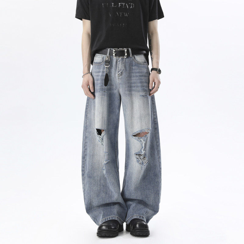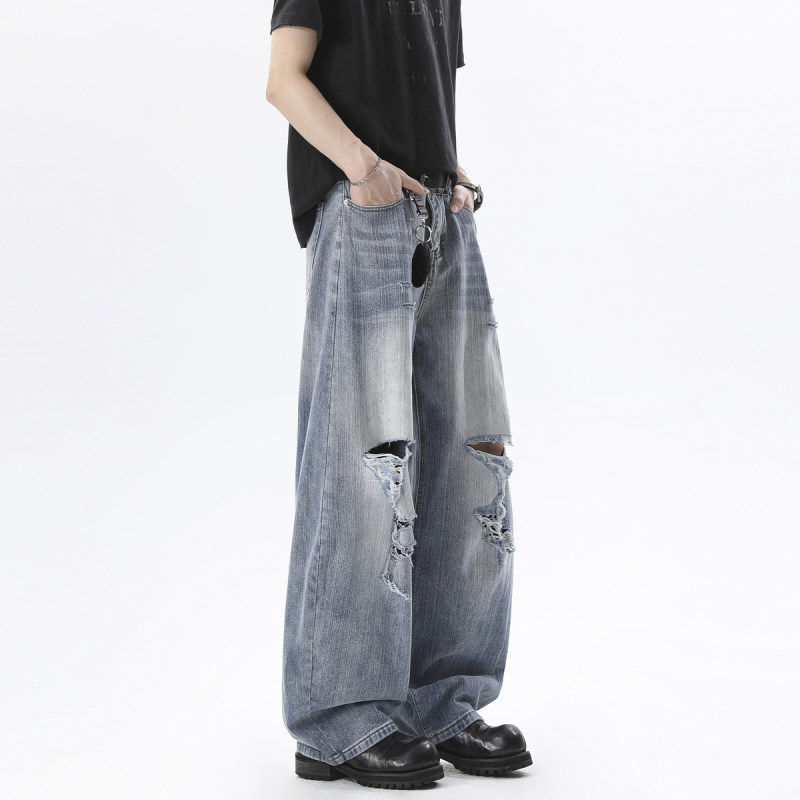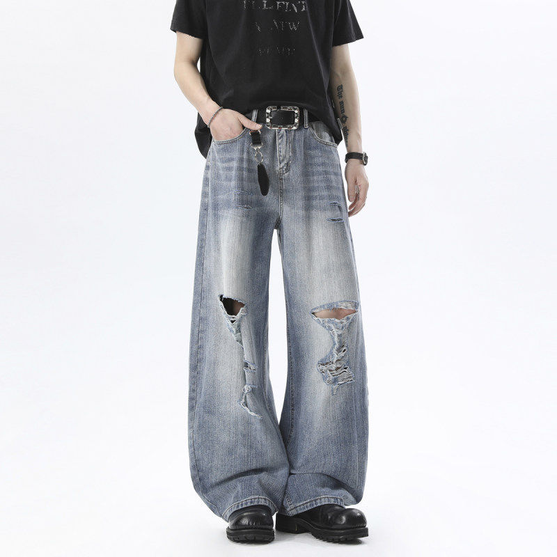 舒适百搭高街时尚 感爆棚轻松驾驭 破洞水洗牛仔阔腿裤 复古美式