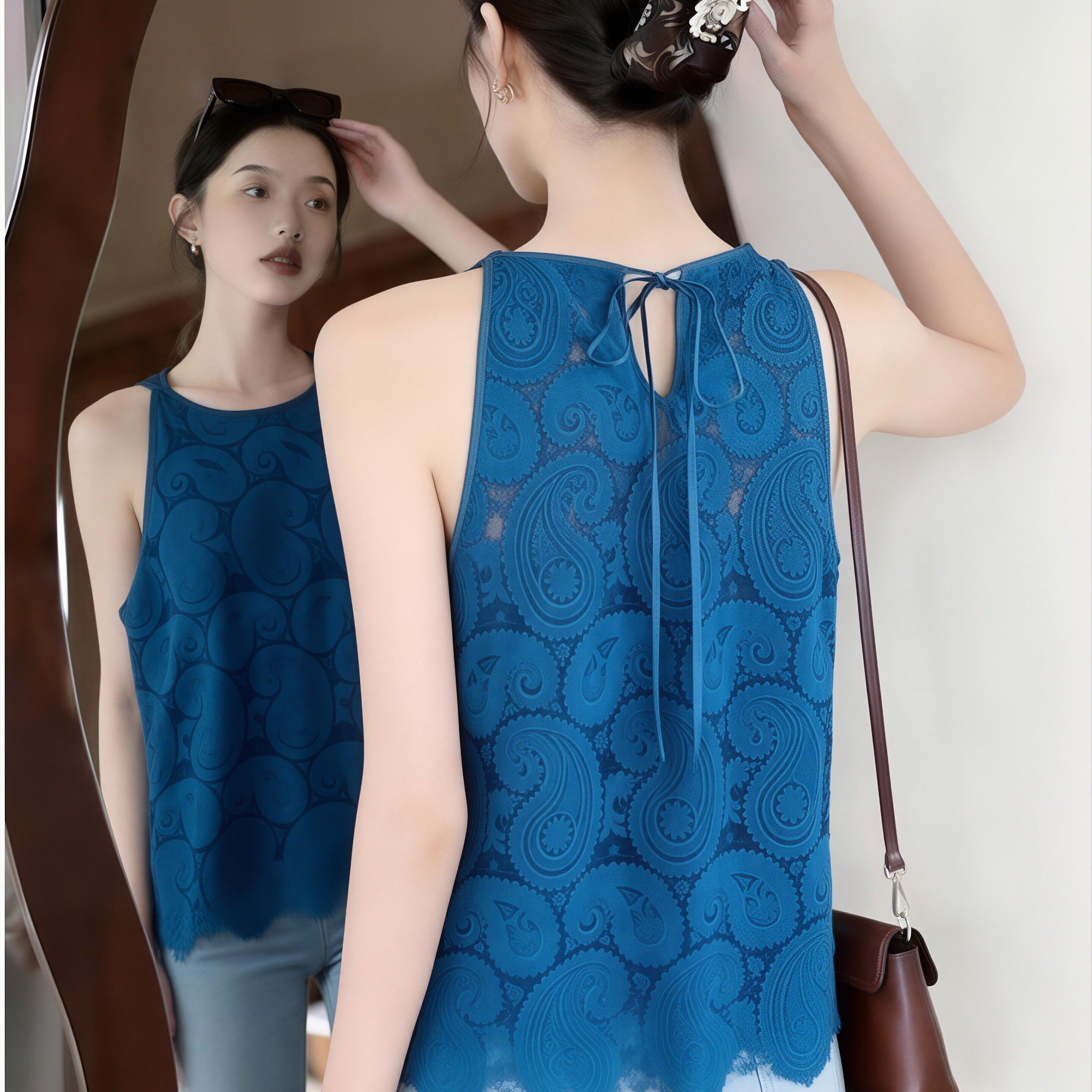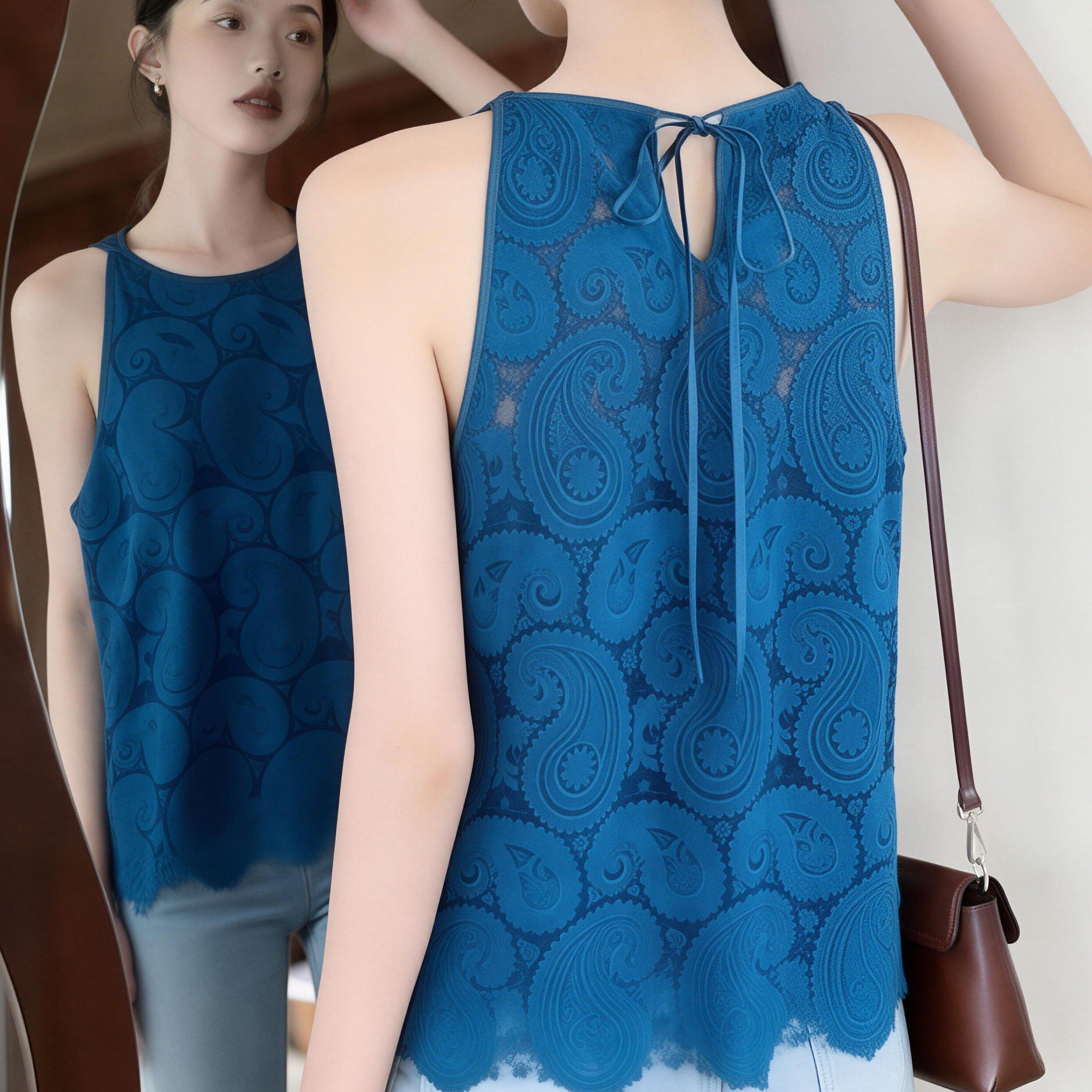 设计感小众克莱因蓝色上衣 绝美漂亮镂空钩花吊带背心外穿女士无袖由
