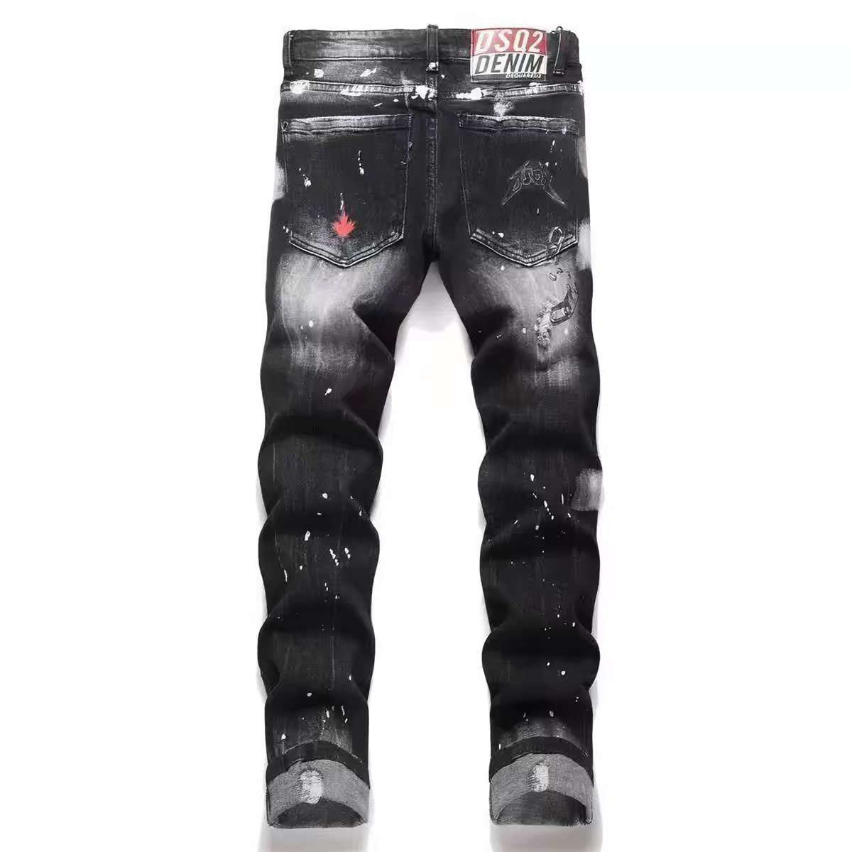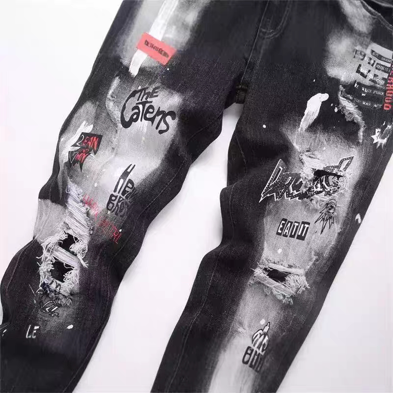 印花小脚涂鸦补丁贴布爆款 轻奢黑色牛仔裤 新款 D2破洞泼墨修身 男裤