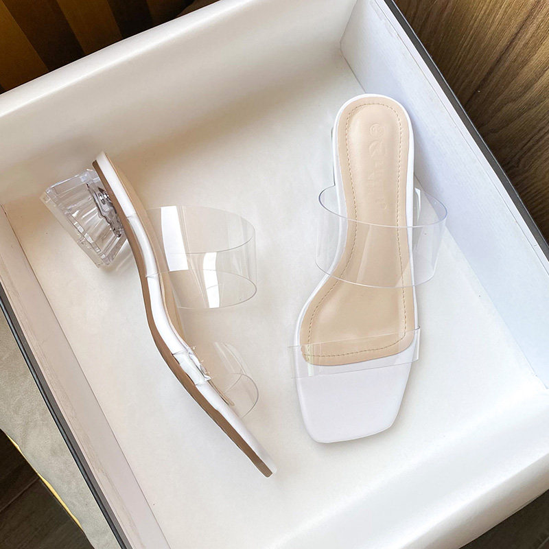 性感外穿时装 羊皮高跟凉拖 网红一字带气质粗跟水晶拖鞋 透明女凉鞋