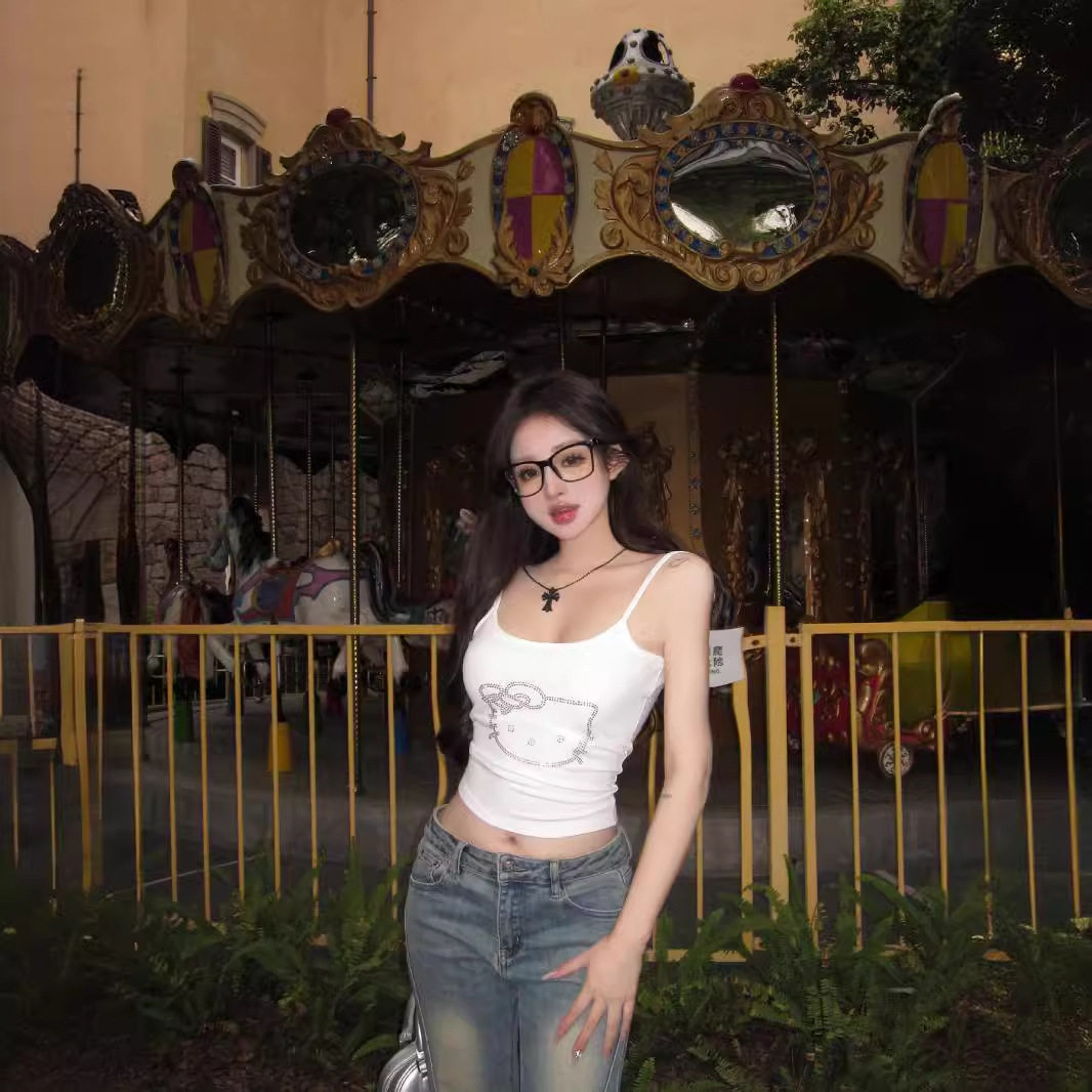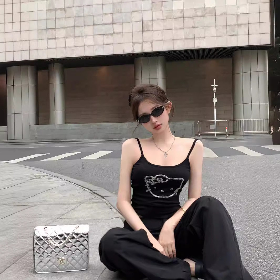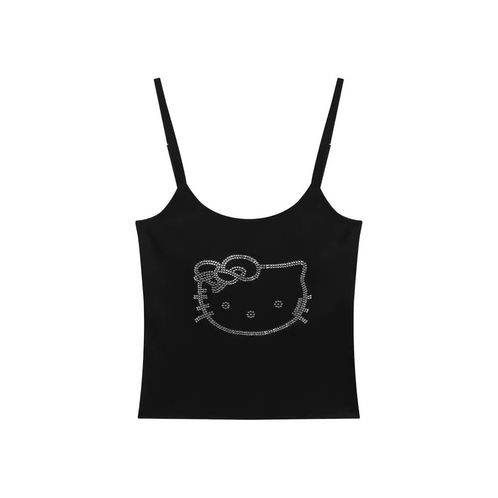 猫咪烫钻小吊带女夏季 无袖 背心甜酷辣妹修身 露脐上衣外穿 黑色短款