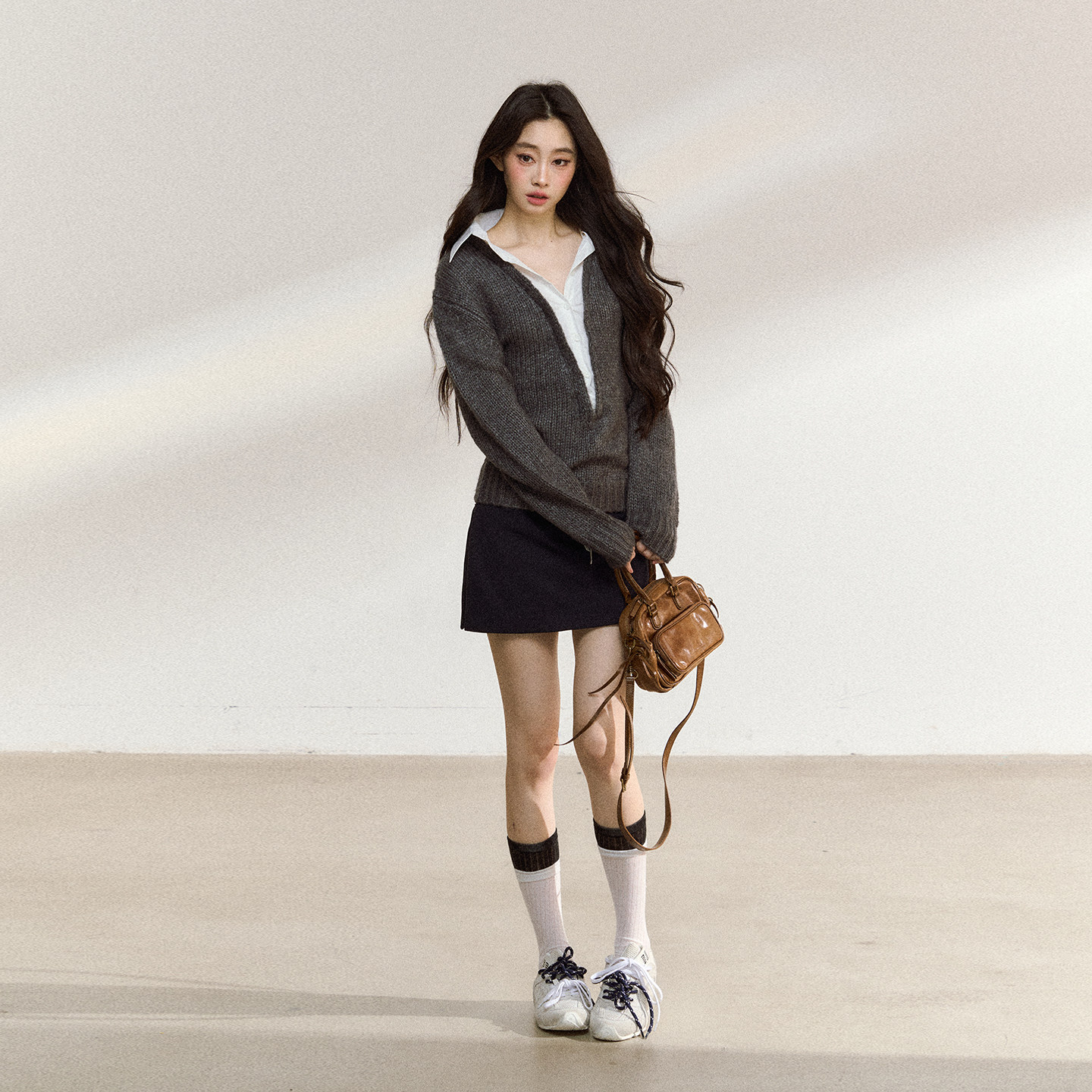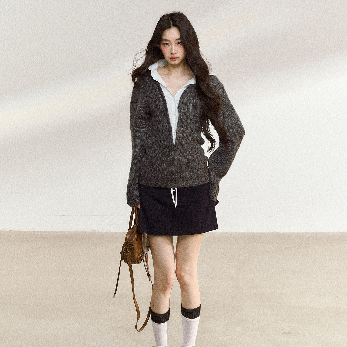 7Shiftin 新款 美式 灰色毛衣女慵懒高级感假两件上衣 原创设计秋季由