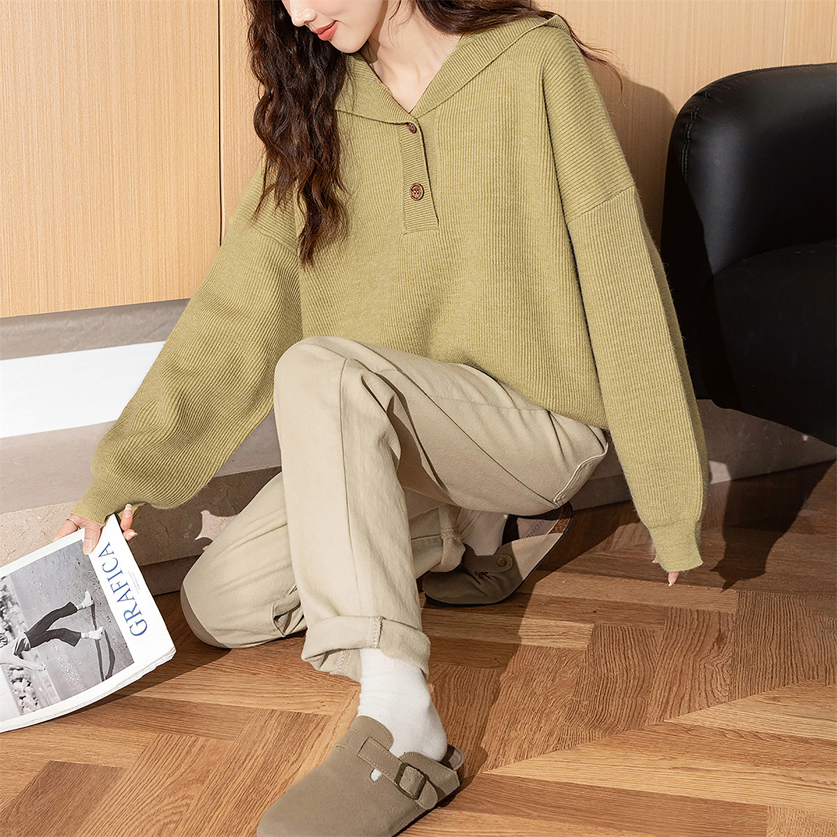 设计感气质一字翻领针织衫 简约百搭休闲显瘦毛衣潮 女2026早春新款