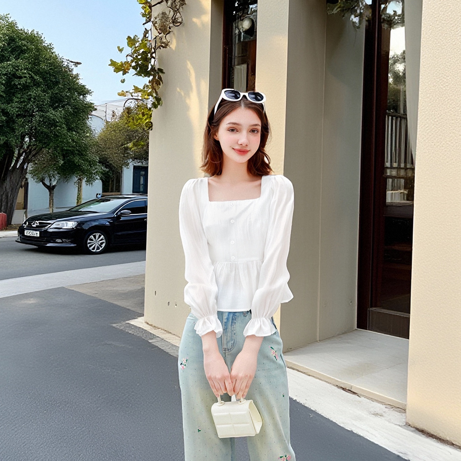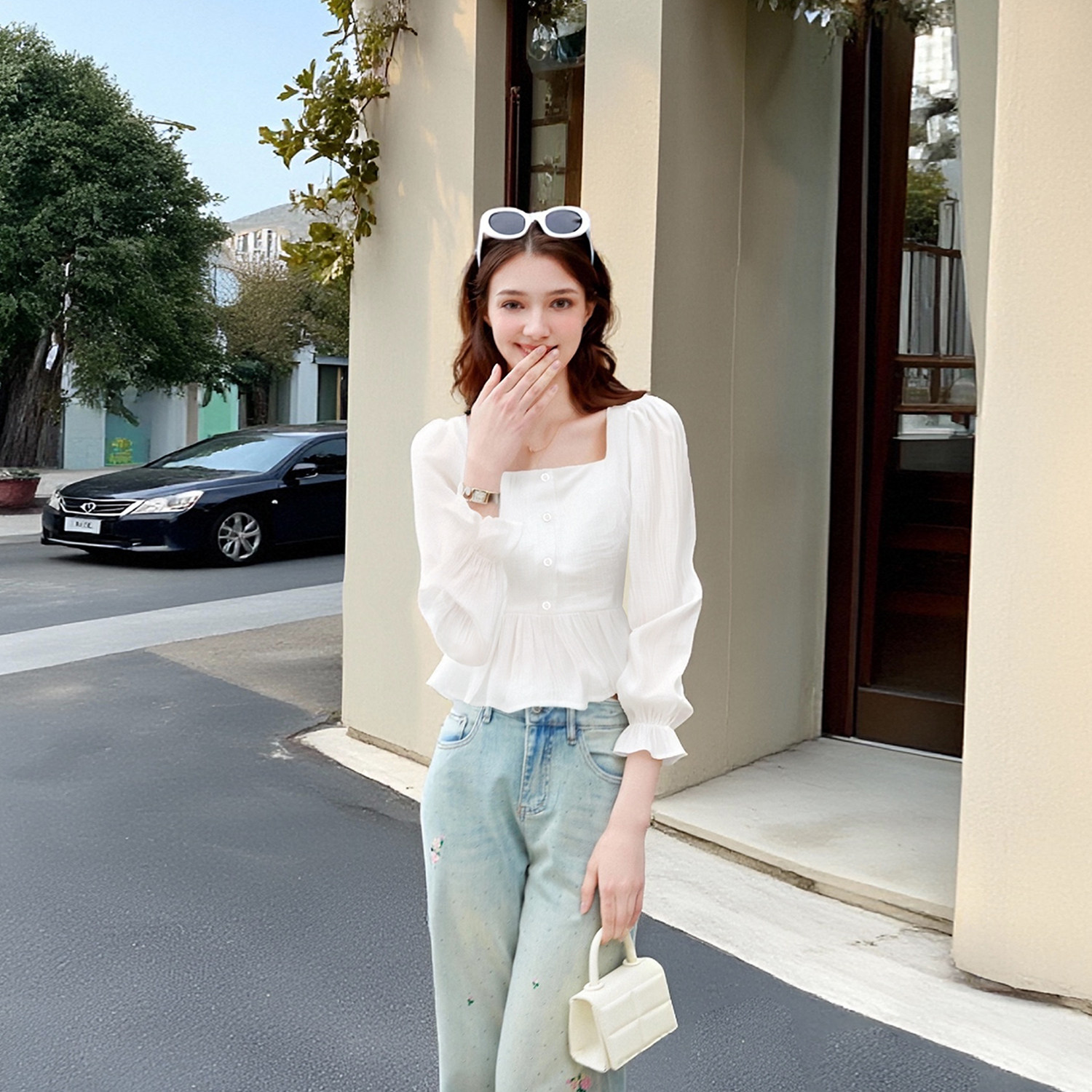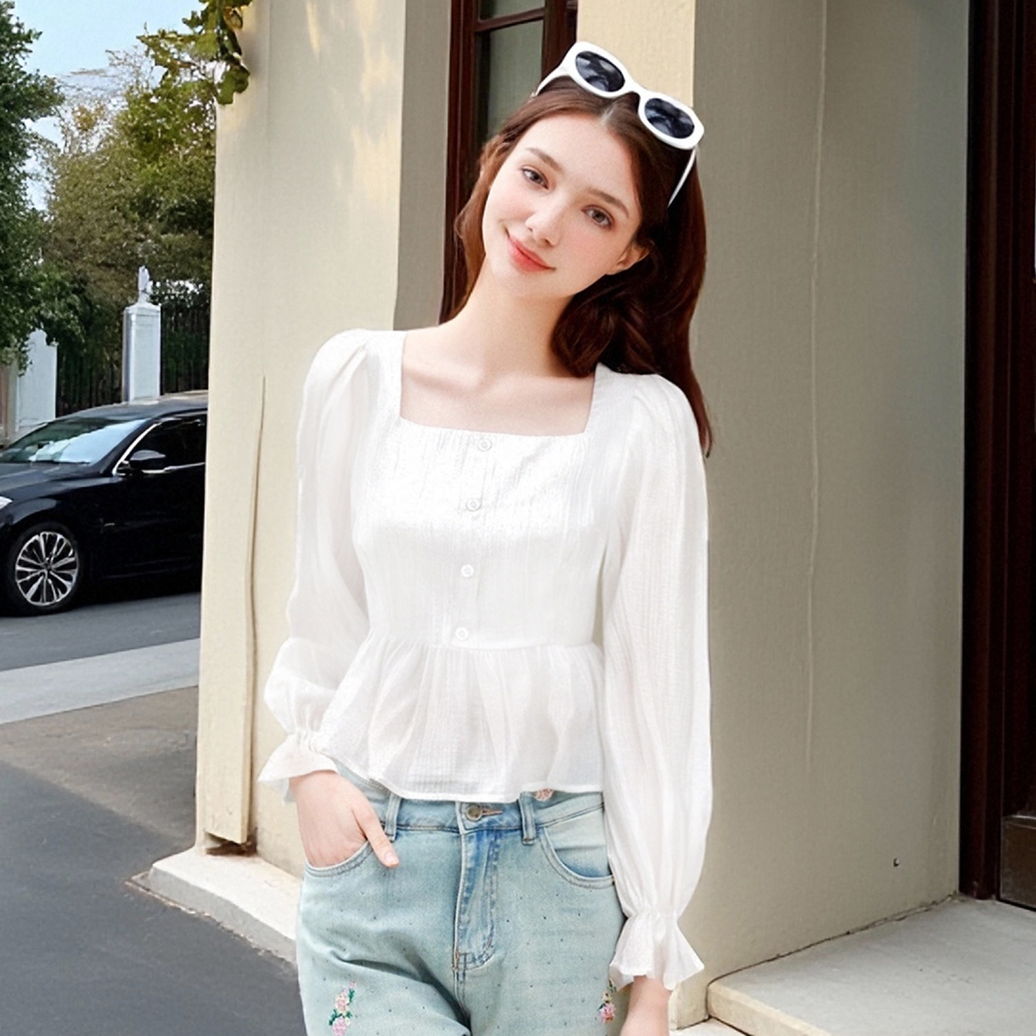 为您提供商品荷叶边方领白长袖 lin法式 独特褶皱短款 上衣温柔优雅高级感 衬衫的详细介绍,