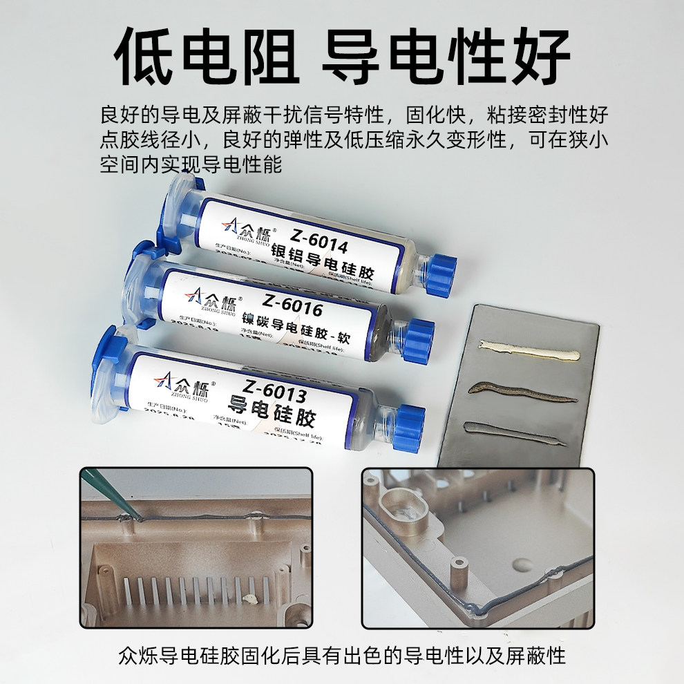 为您提供商品6014柔性银铝导电胶水导电硅胶弹性EMI屏蔽金属导电胶 众烁6013的详细介绍,