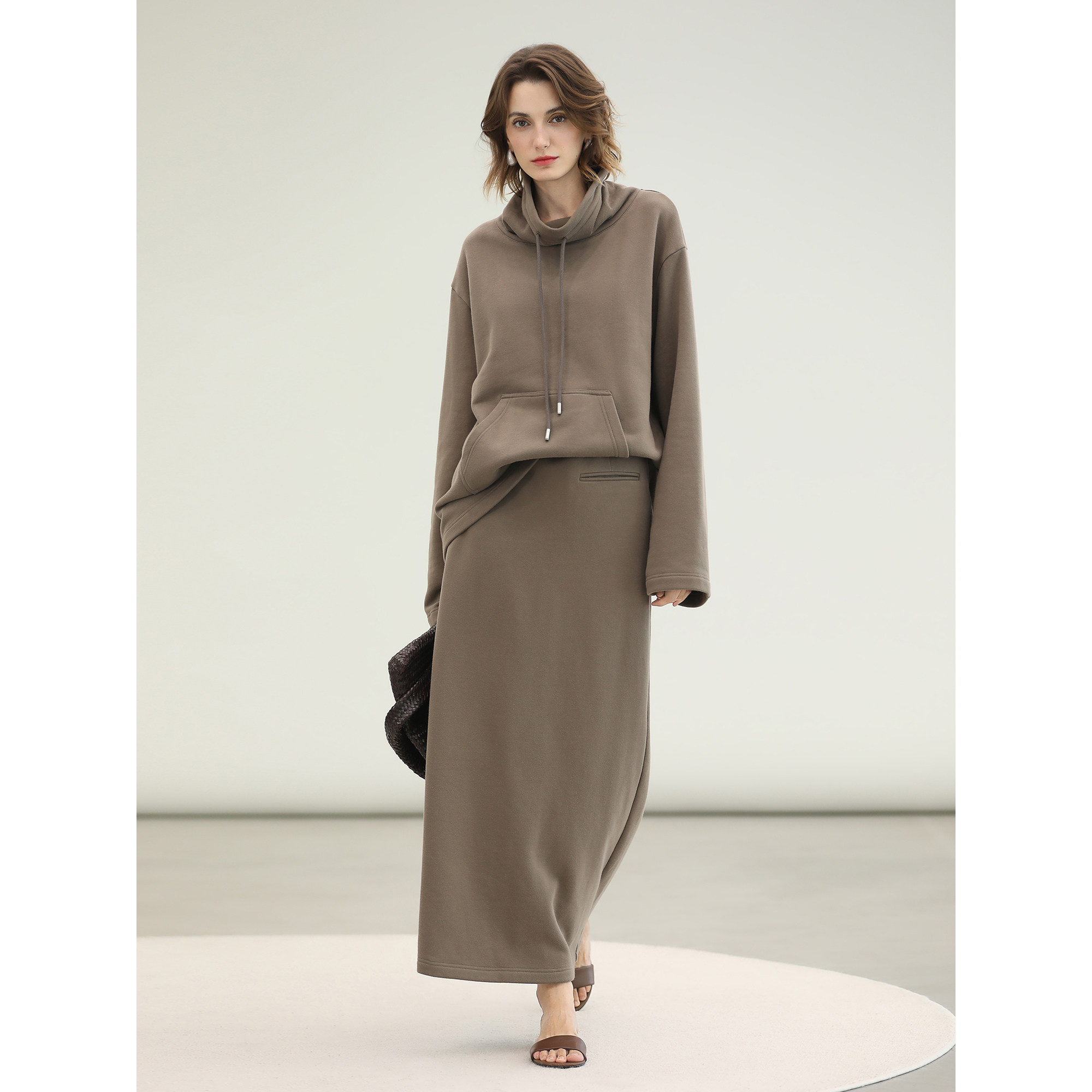 洋气上衣套头加厚绒衫 潮 全棉修身 即墨杏色圆领正肩卫衣女加绒冬季