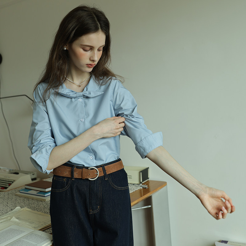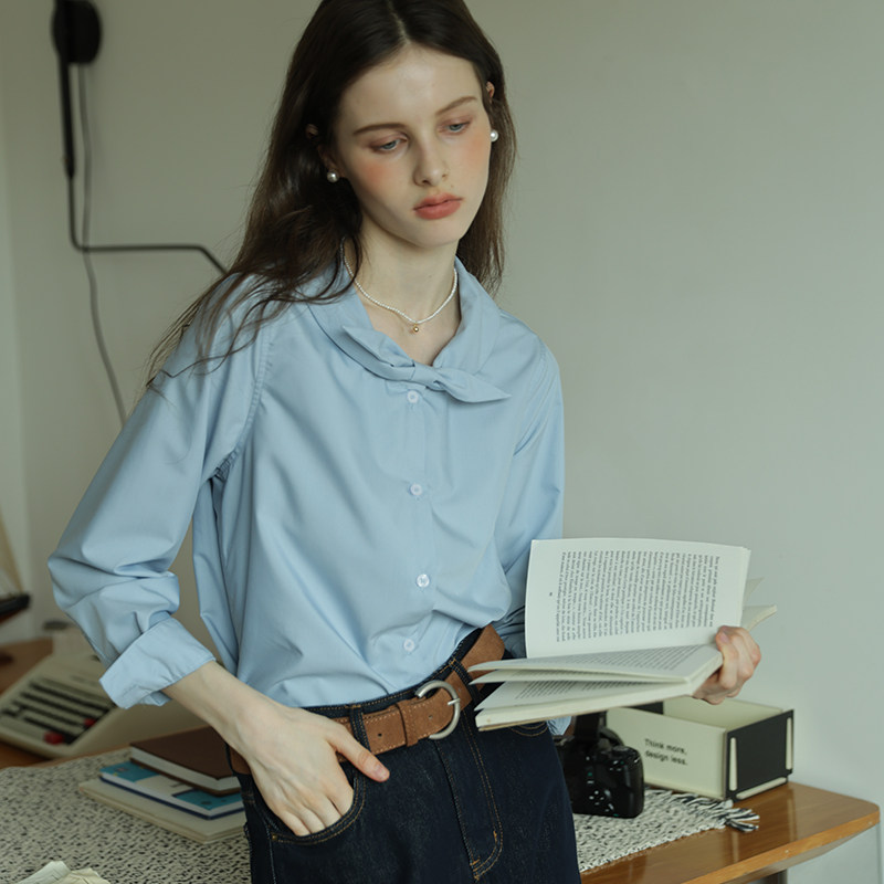 女春新款 百搭正肩抗皱免烫通勤衬衣 减龄蝴蝶结系带衬衫 复古法式