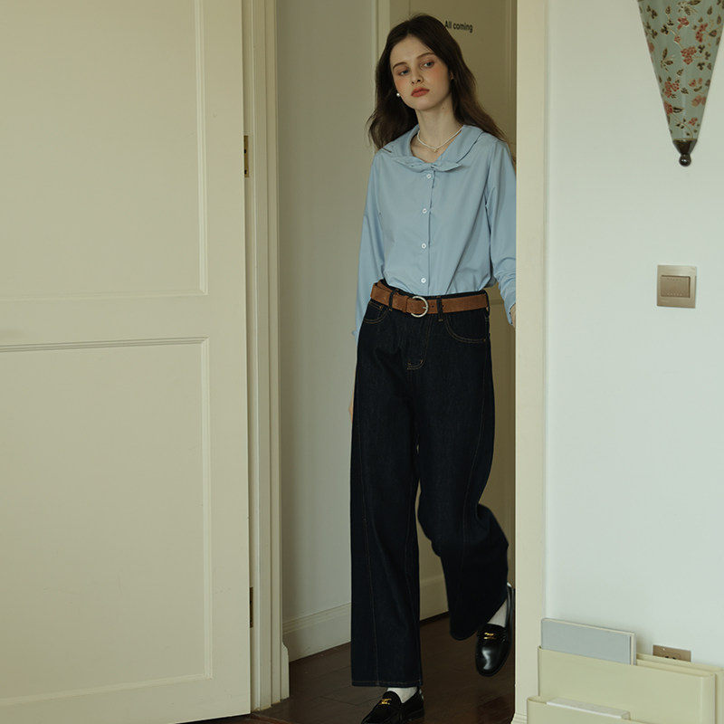 蓝色翻领水洗牛仔衬衫 秋季 宽松休闲纯色长袖 上衣外套 男生2026新款