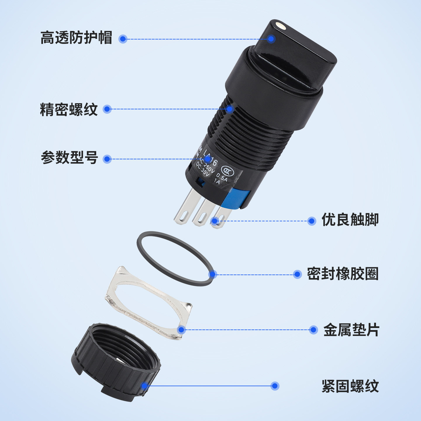 为您提供商品11X2常开Y常闭短柄旋钮选择开关2二档位3档22X3自锁16mm 奥盟LA16的详细介绍,