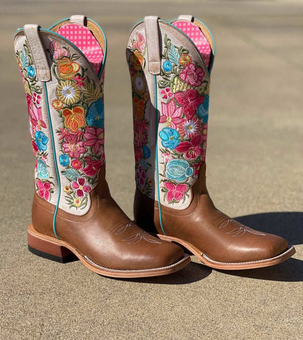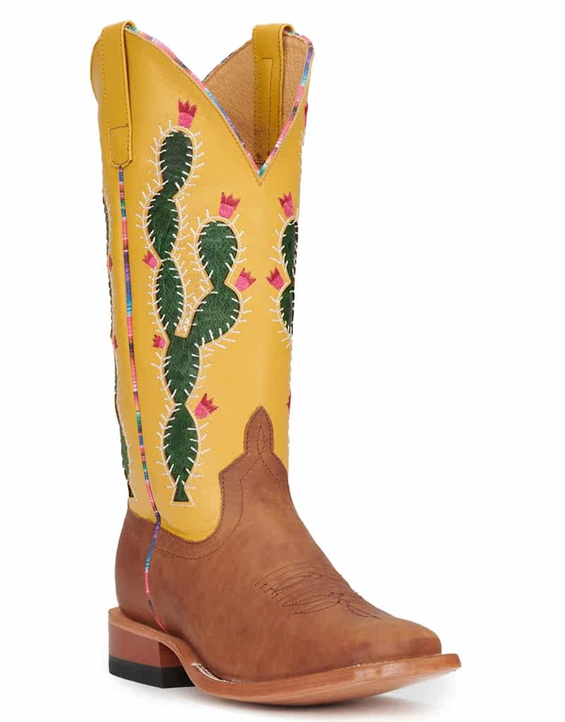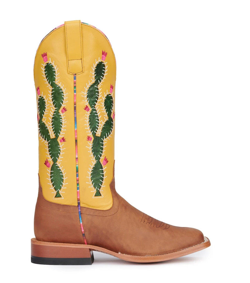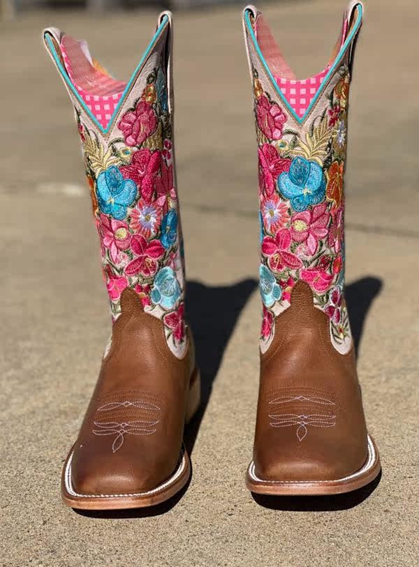 MB头层牛皮真皮拼接仙人掌刺绣方头高筒靴马靴西部牛仔靴女 Macie