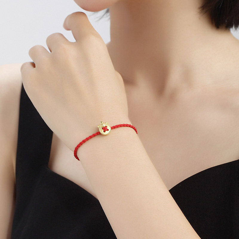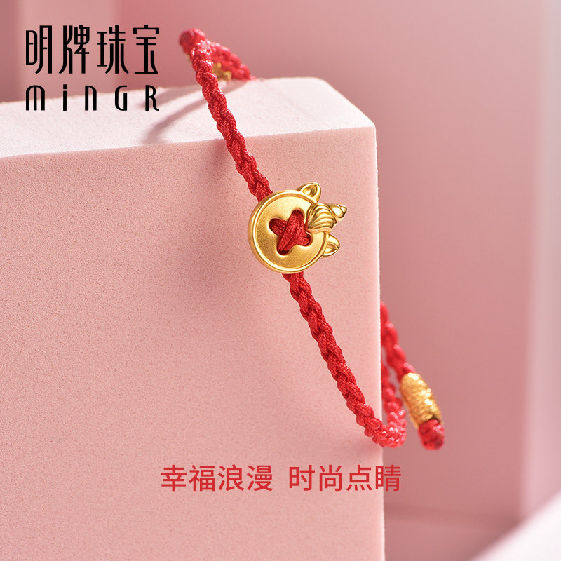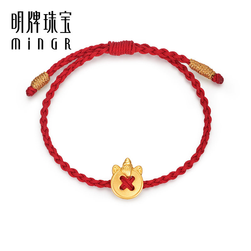 明牌珠宝硬金独角兽串珠t黄金幸福纽扣编织手绳足金手链AFP0674由