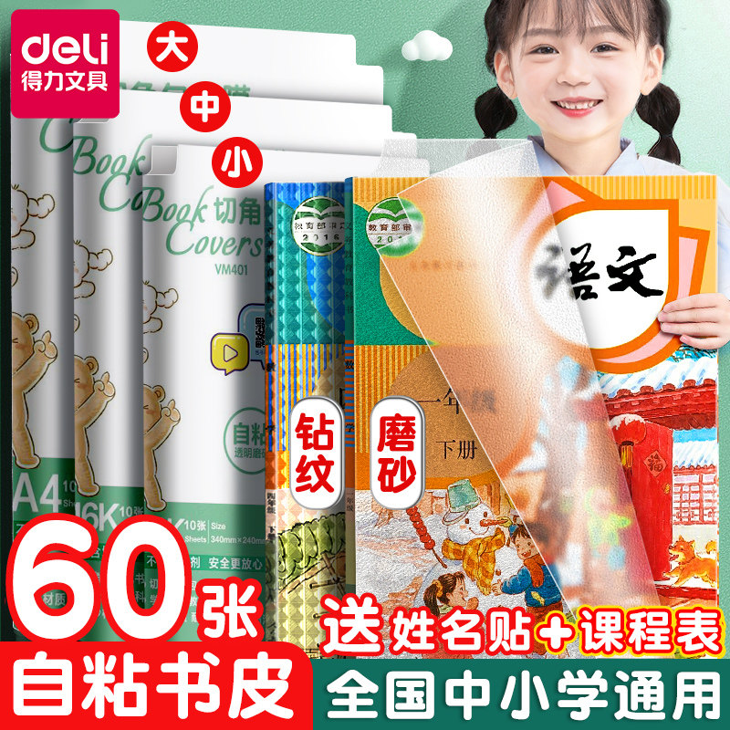 得力包书皮自粘透明书皮贴纸书套包书膜透明磨砂加厚小学生一二三四年级下册A4书壳塑料作业课本书衣保护全套