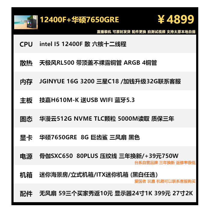 5600X 春节保价 华硕7650GRE 12600KF 9600X海景房主机 7500F由