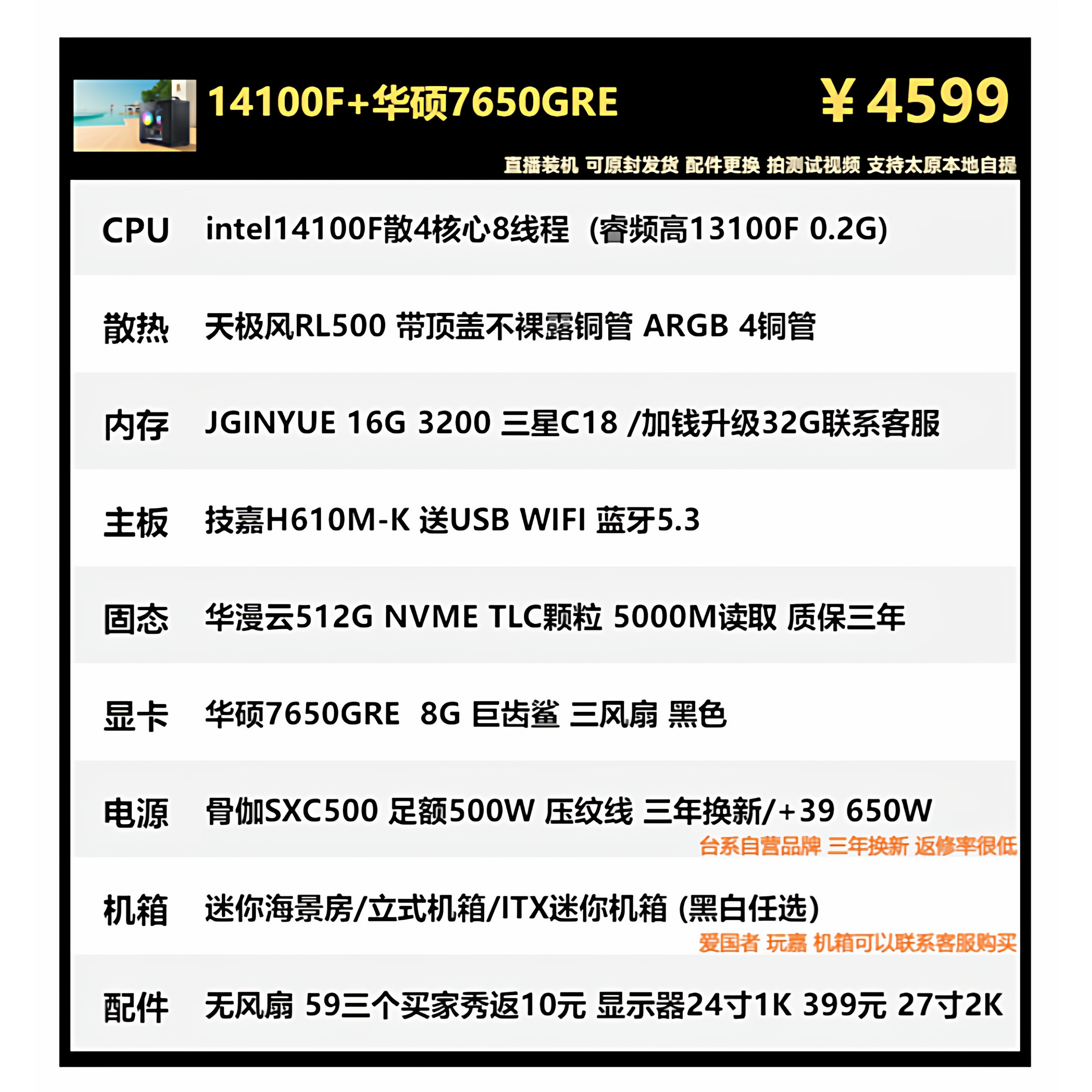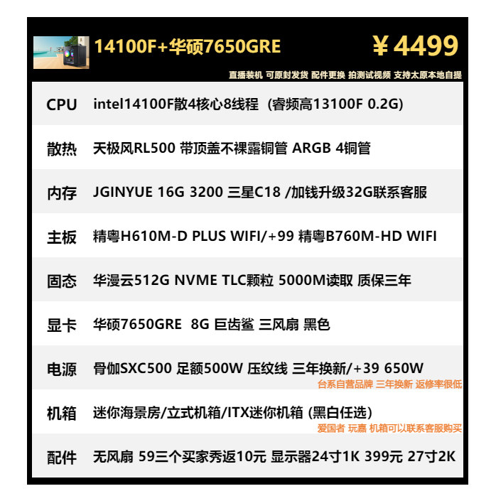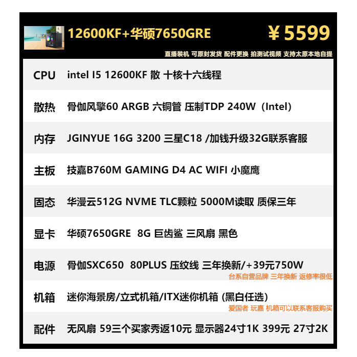 5600X 春节保价 华硕7650GRE 12600KF 9600X海景房主机 7500F