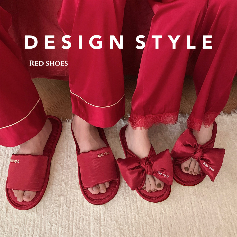 细细条一字喜庆绸面情侣鞋 通用冬季 男女红色拖鞋 休闲结婚轻便四季由