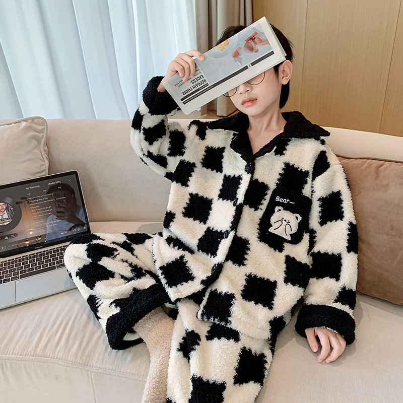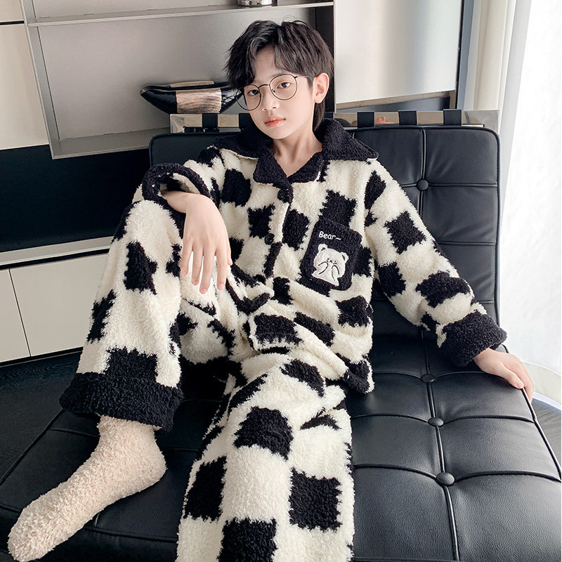 家居服加绒加厚男孩冬季 法兰绒中大童珊瑚绒 男童睡衣秋冬款 儿童装