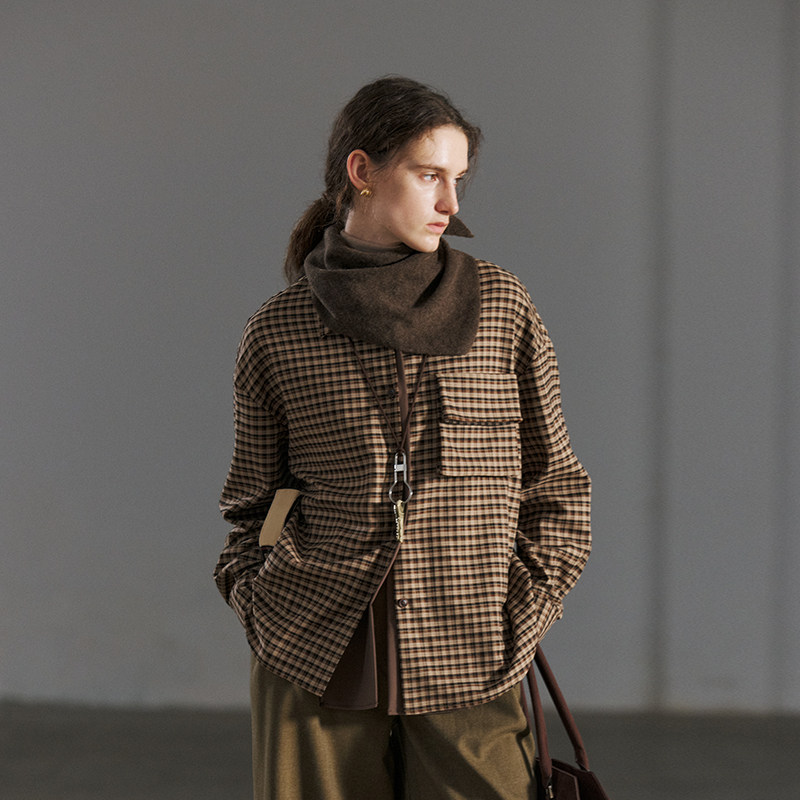 NON 格子衬衫 女设计感立体口袋长袖 衬衣 RESTRAIN复古假两件落肩袖由