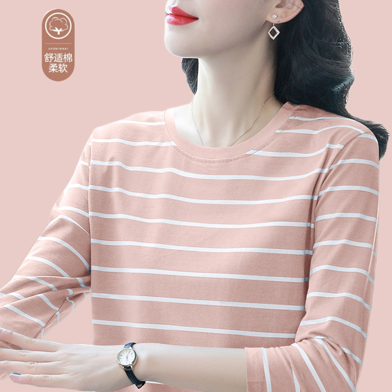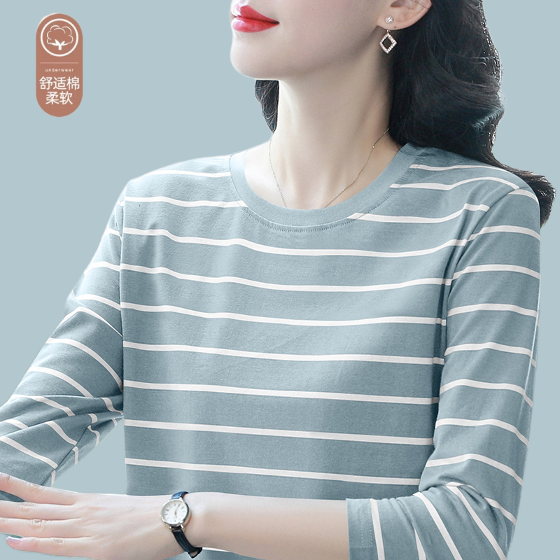 条纹秋衣薄款 春秋装 纯棉上衣长袖 t恤女士宽松大码 内搭母亲打底衫由
