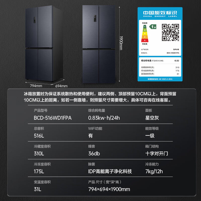 516WD1FPA双净双系统十字四开门家用无霜变频三包机 容声冰箱BCD由