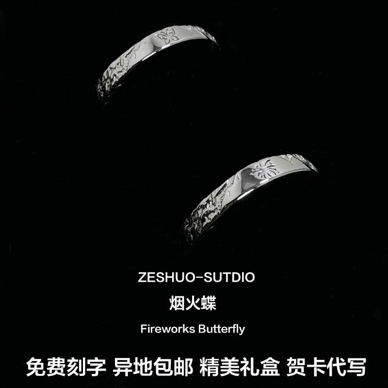 ZESHUO烟花蝶 足银戒指 原创设计雕刻蝴蝶情侣对戒999纯银一对款