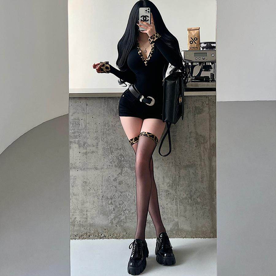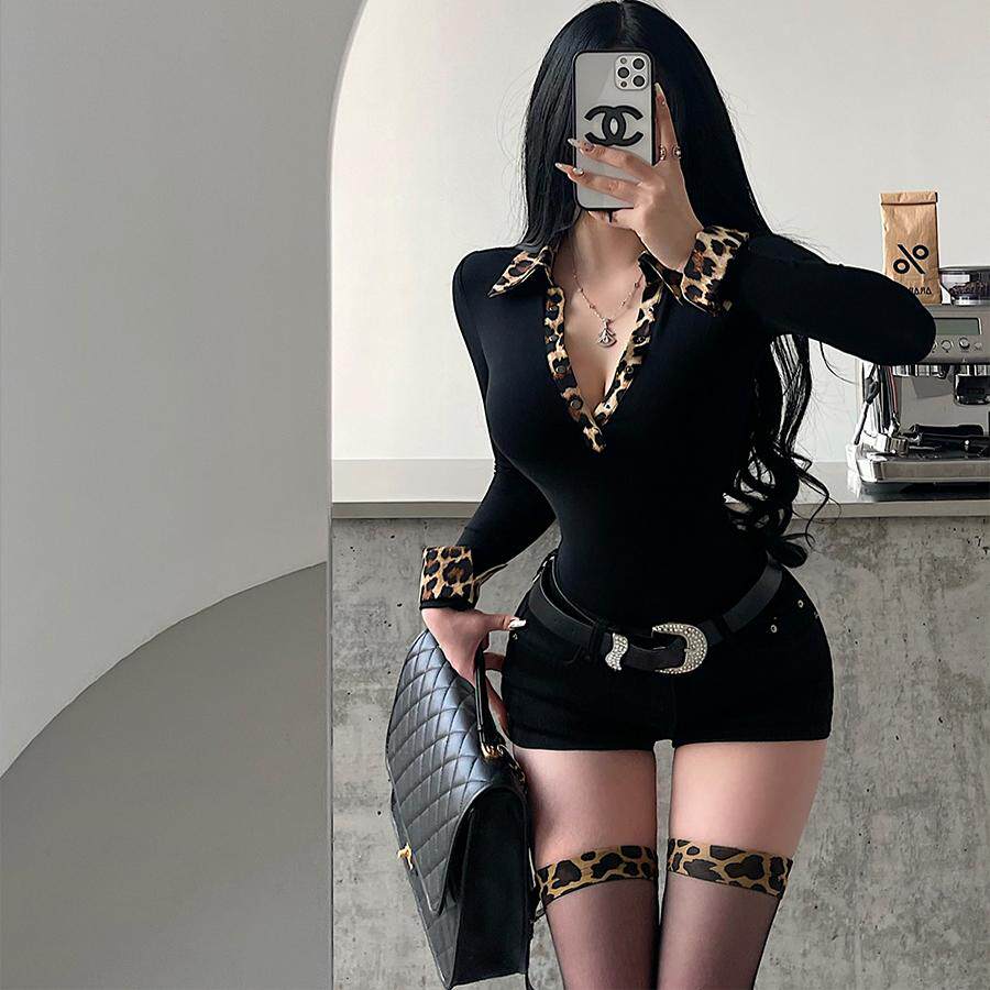 显瘦豹纹拼接翻领打底长袖 T恤上衣 纯欲辣妹性感修身 YoungGirlDay