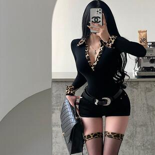 为您提供商品显瘦豹纹拼接翻领打底长袖 T恤上衣 纯欲辣妹性感修身 YoungGirlDay的详细介绍,