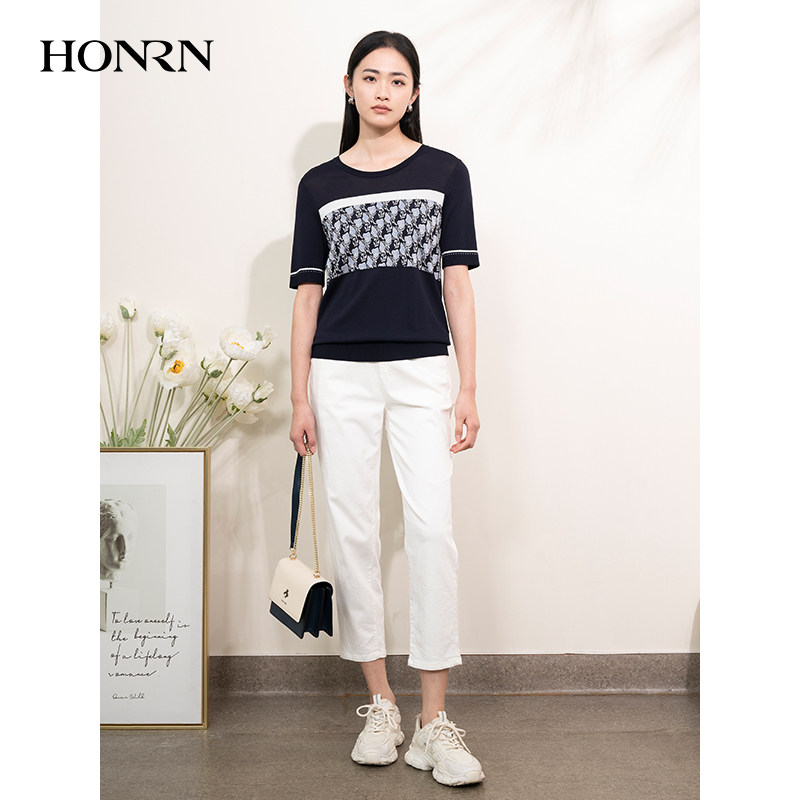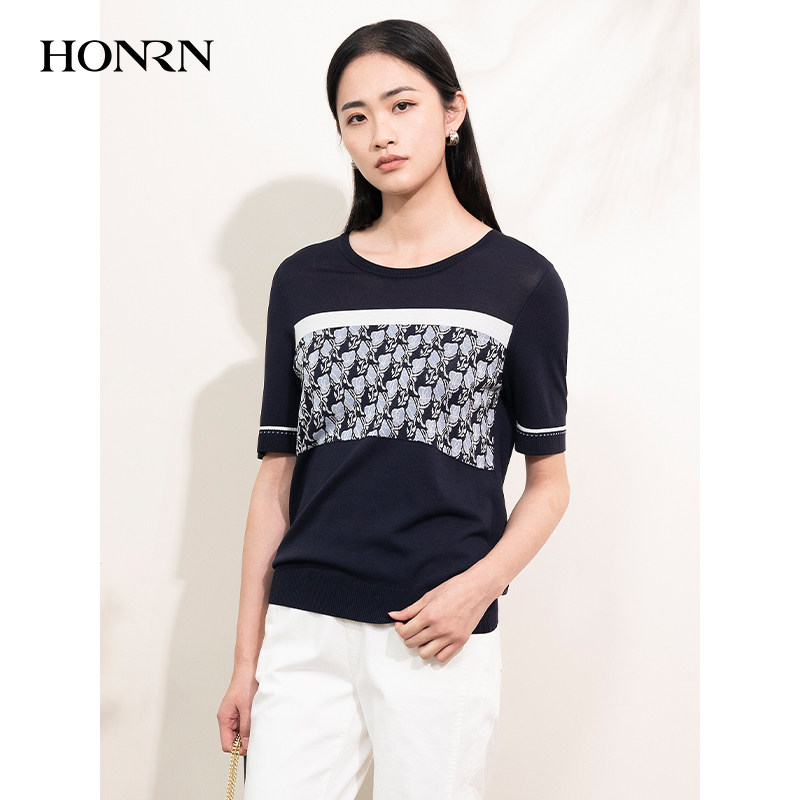 HONRN 针织衫 上衣女夏季 HI22OM665 红人宽松休闲提花圆领套头短袖