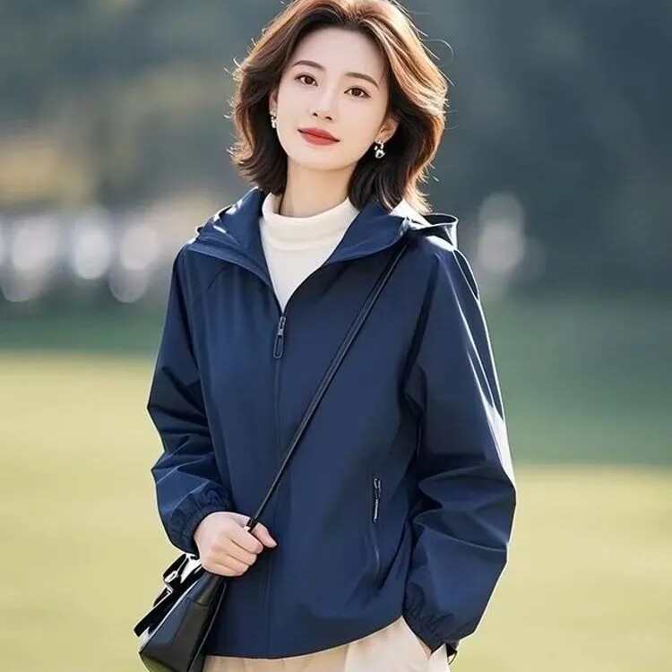 洋气连帽宽松休闲冲锋衣大码 两层防水防风夹克 外套女时尚 春秋短款