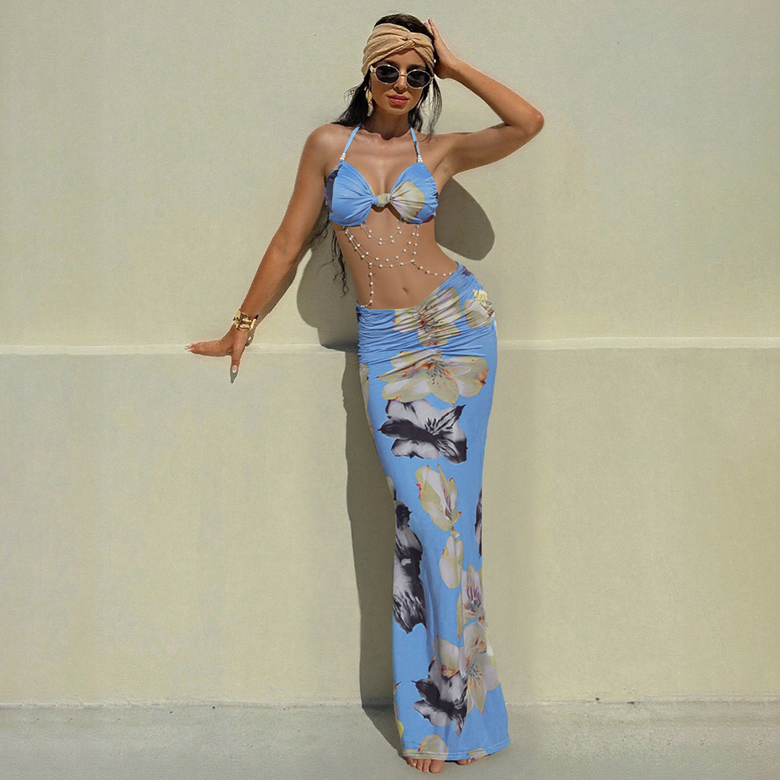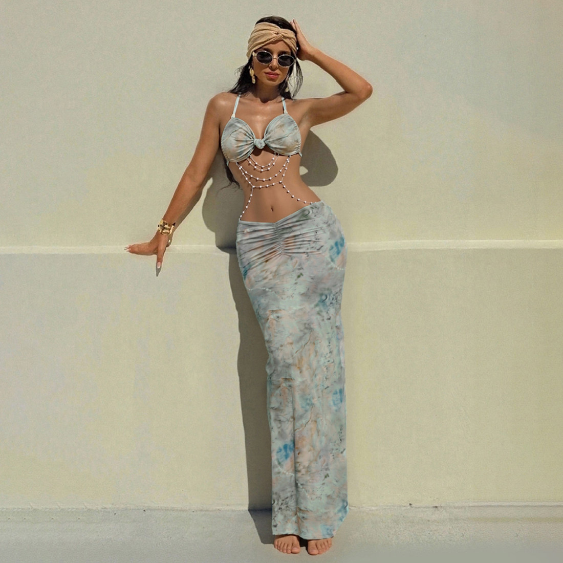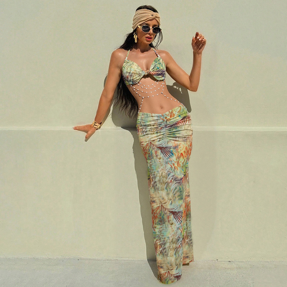 SylCue 纯欲性感镂空晕染印花挂脖连衣裙显瘦包臀长裙子 罗马假日