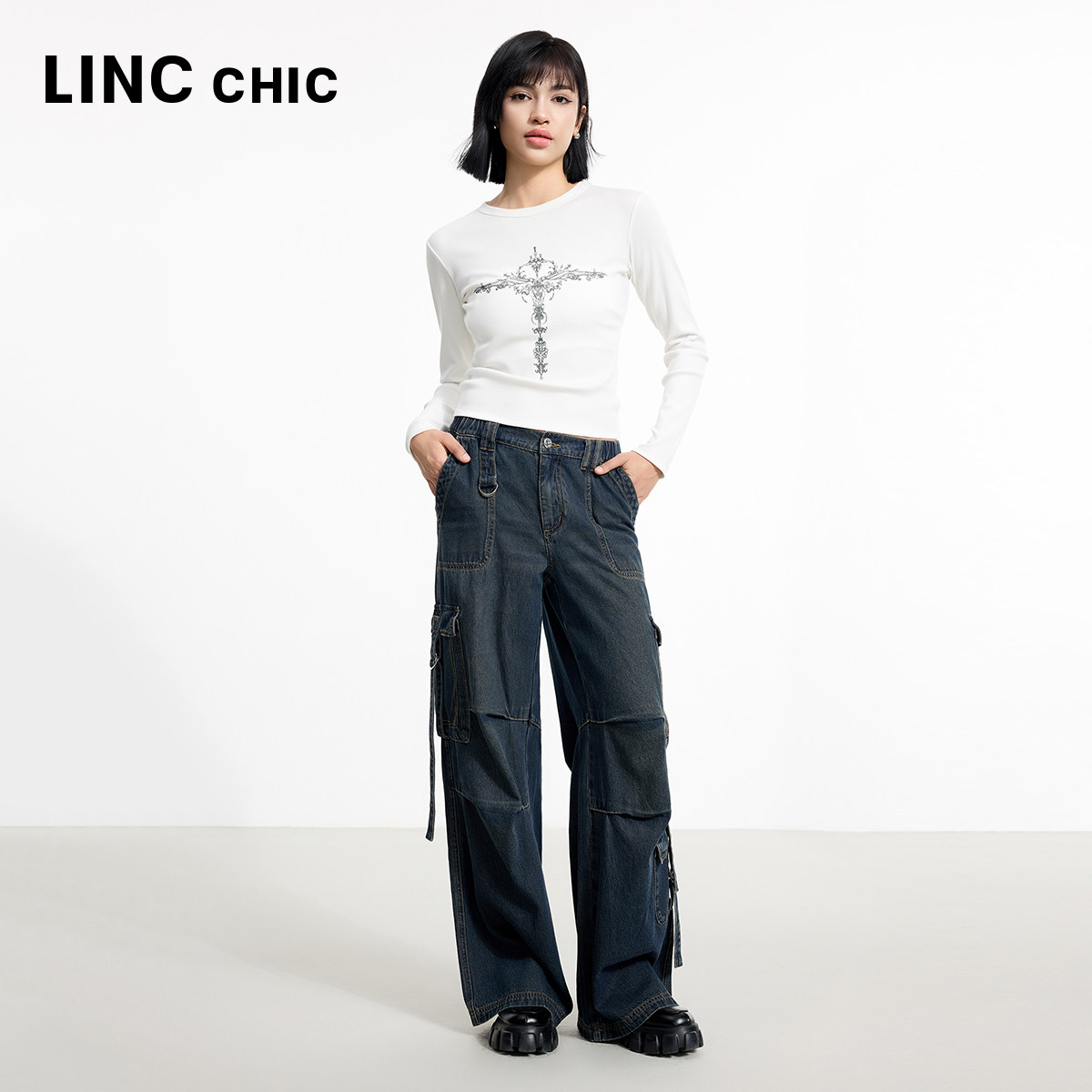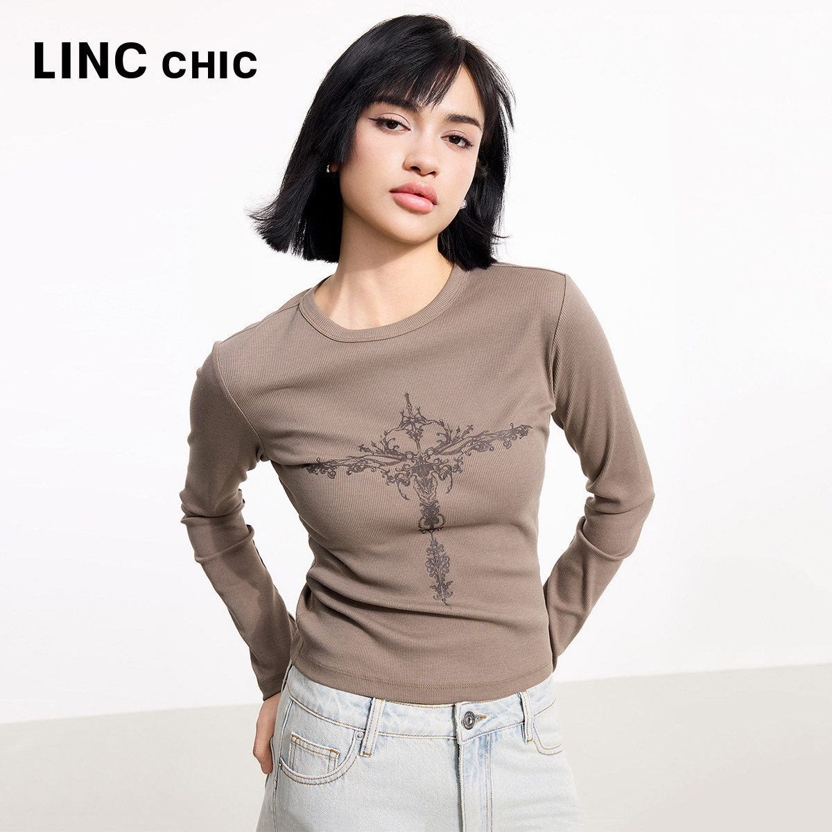 LINC金羽杰打底衫 圆领印花修身 长袖 T恤女内搭上衣FK077YY 女春新款由