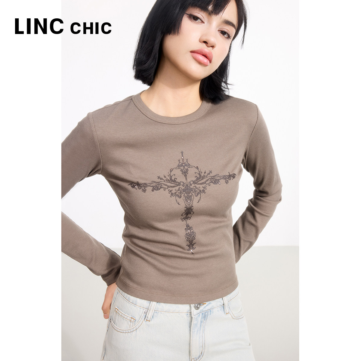 LINC金羽杰打底衫 圆领印花修身 长袖 T恤女内搭上衣FK077YY 女春新款