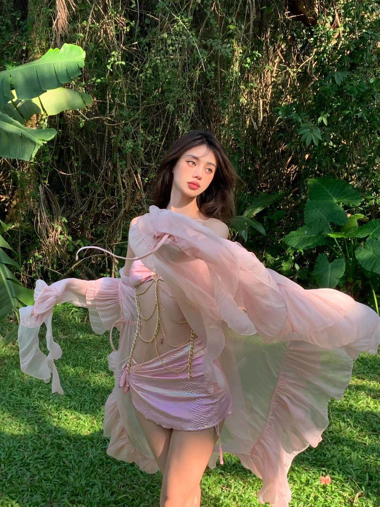 新款 罩衫 可爱显瘦遮肉沙滩度假泳装 ins比基尼分体泳衣女微透长袖