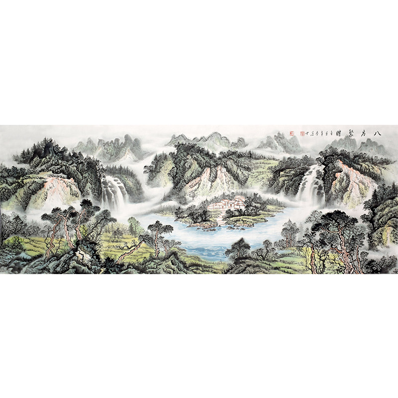 纯手绘八方聚财山水画客厅办公室招财靠山聚宝盆国画挂画芯可带框