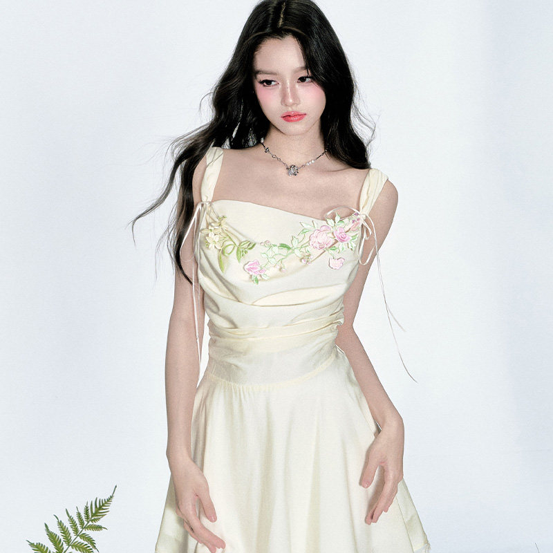 易碎商店·蜜语轻纱 重工刺绣度假风鹅黄色荡领连衣长裙 现货由
