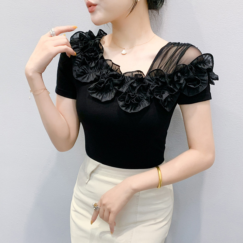 体恤衫 欧货立体花边T恤女短袖 半袖 性感网纱拼接上衣修身 夏季 新款由