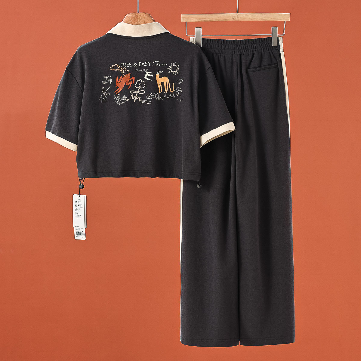 拼色运动套装 西湖阁老 915弜 高腰抽绳直筒裤 翻领短T 栖 夏装由