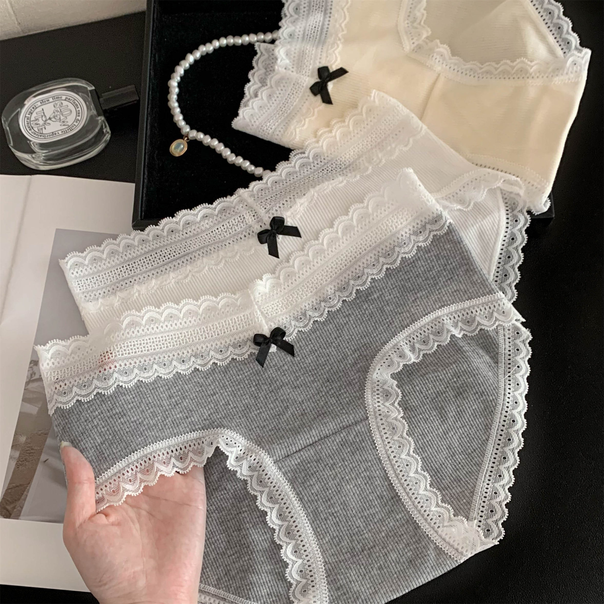 六只兔子3条装 女纯棉底裆中腰不夹臀短裤 甜美蕾丝三角裤 棉质内裤
