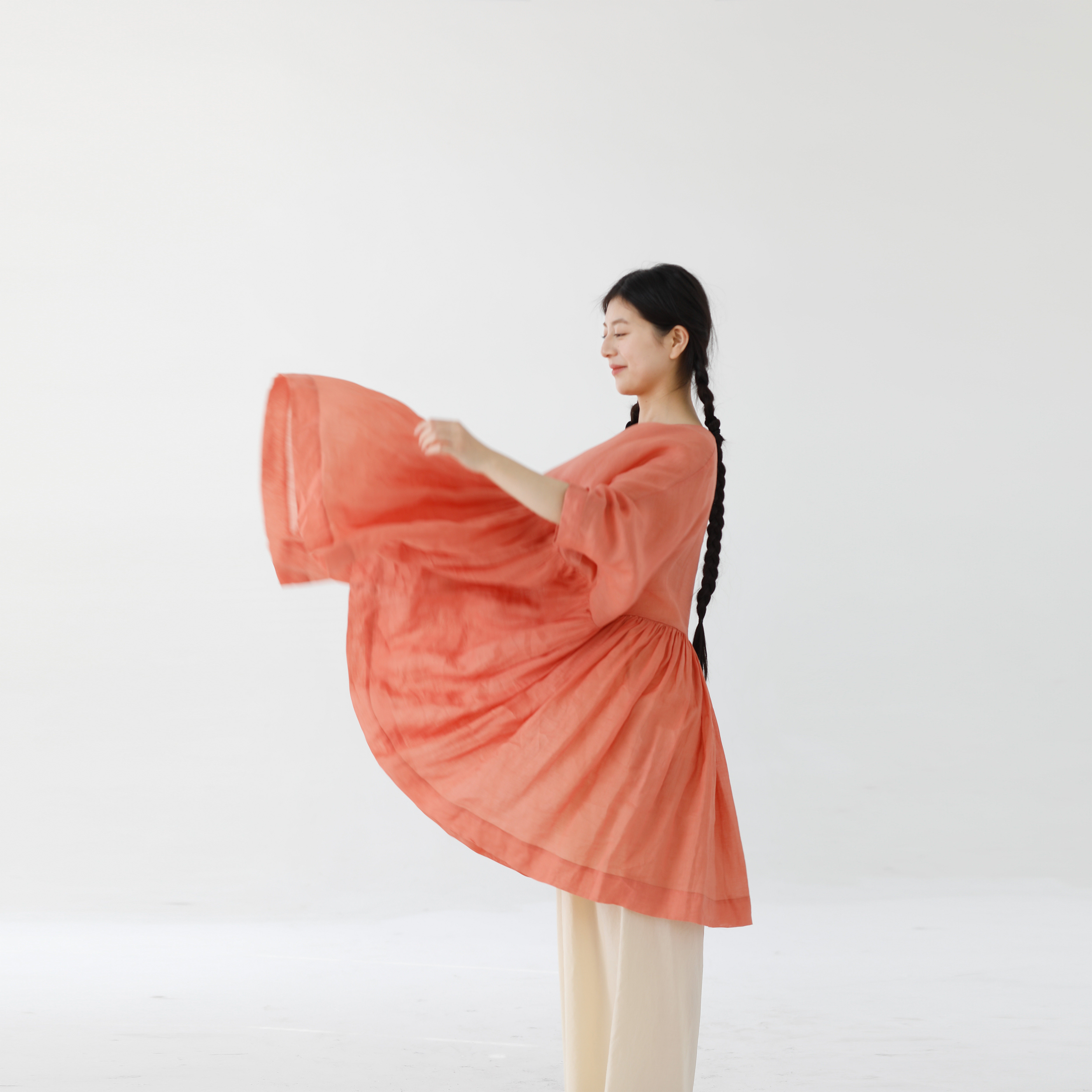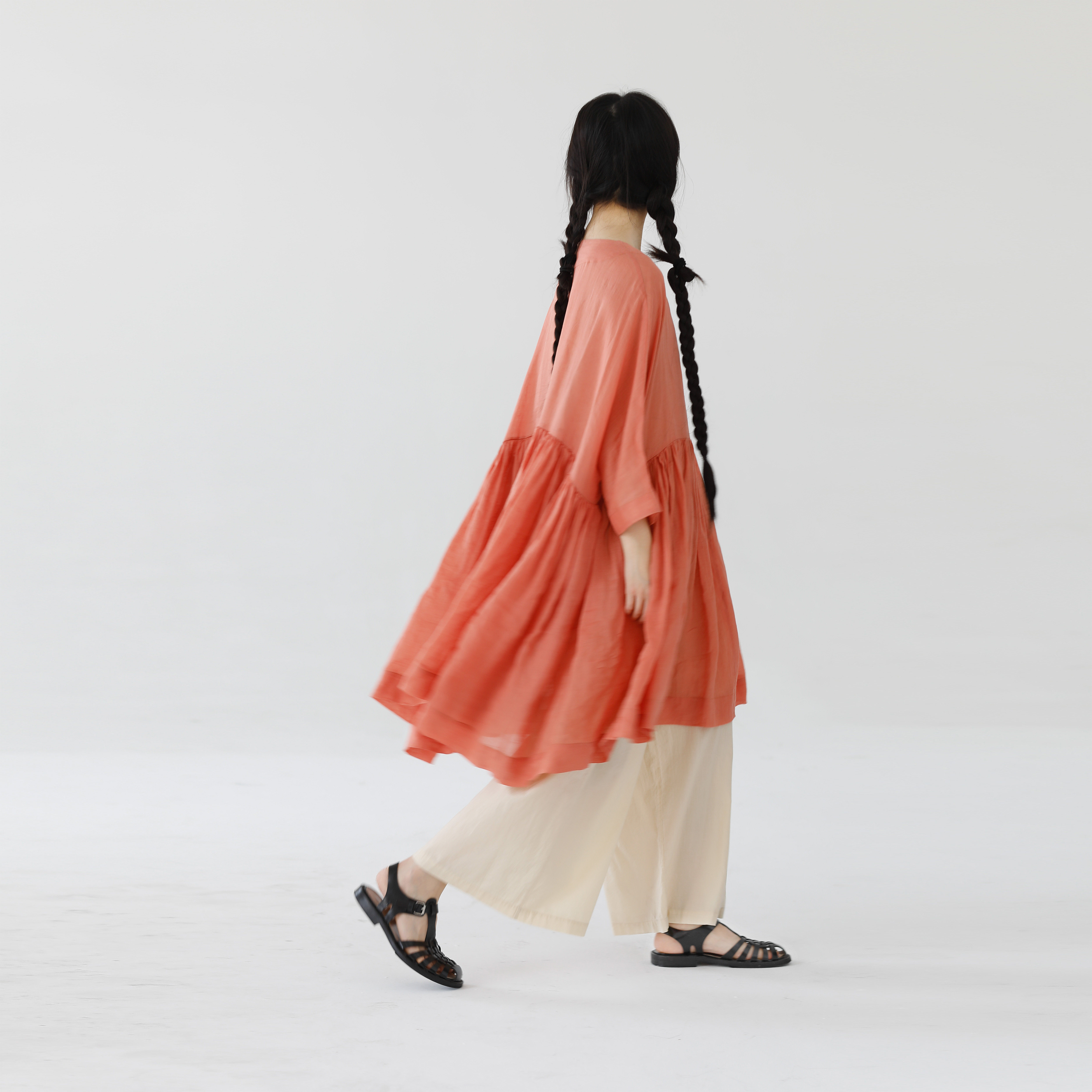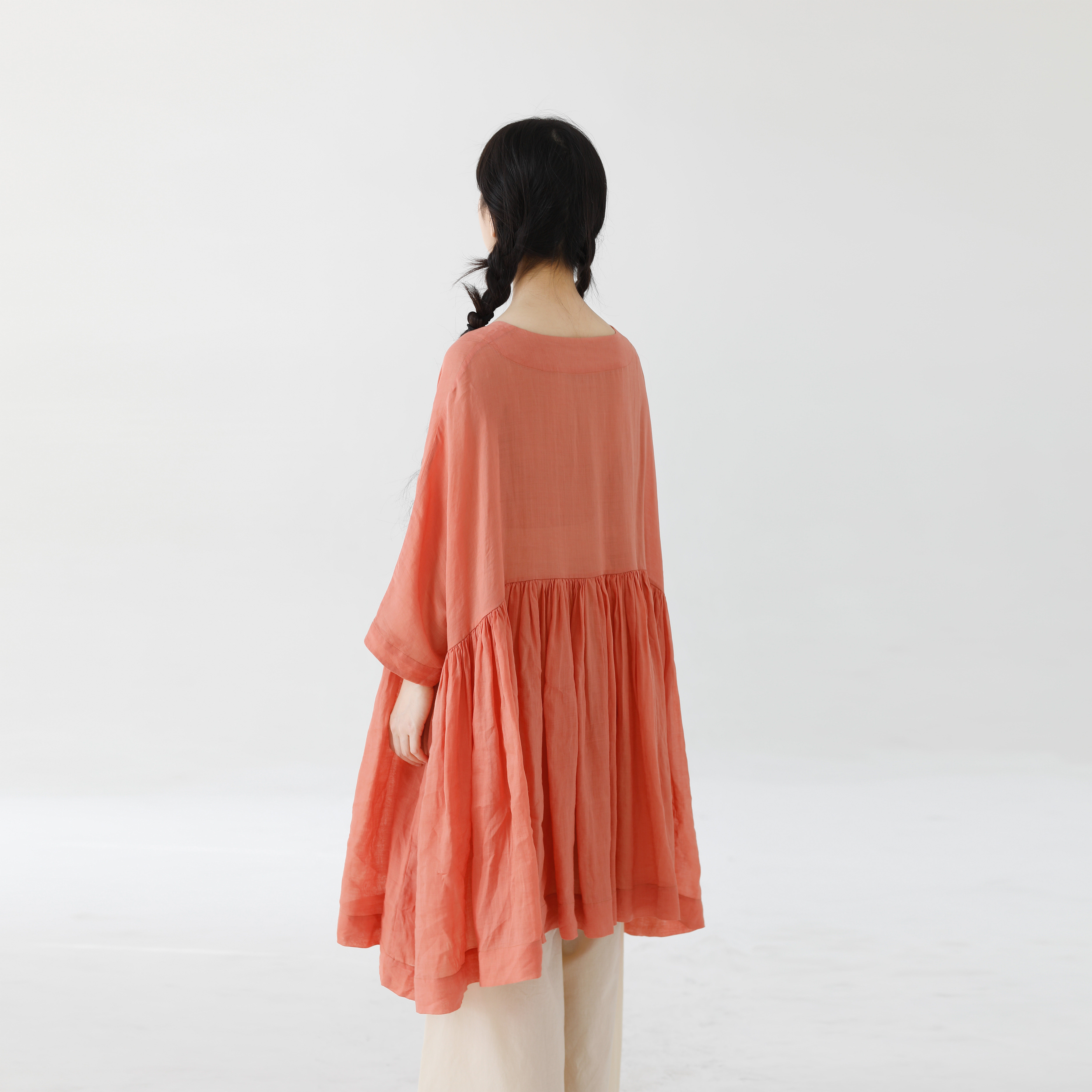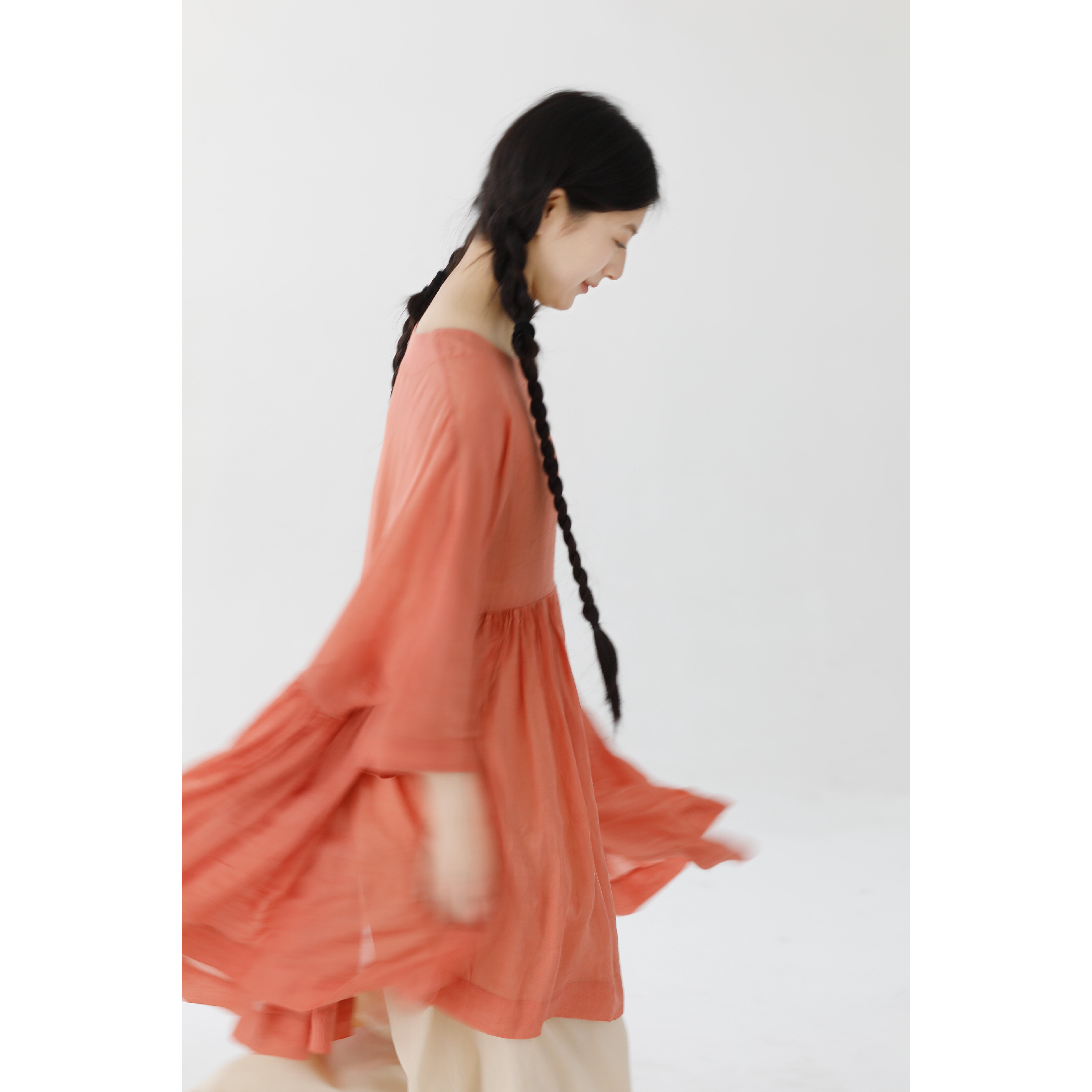 复述珊瑚橘红活力感多褶飘逸感文艺苎麻大摆套头衫 上衣 短袖