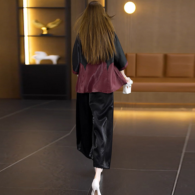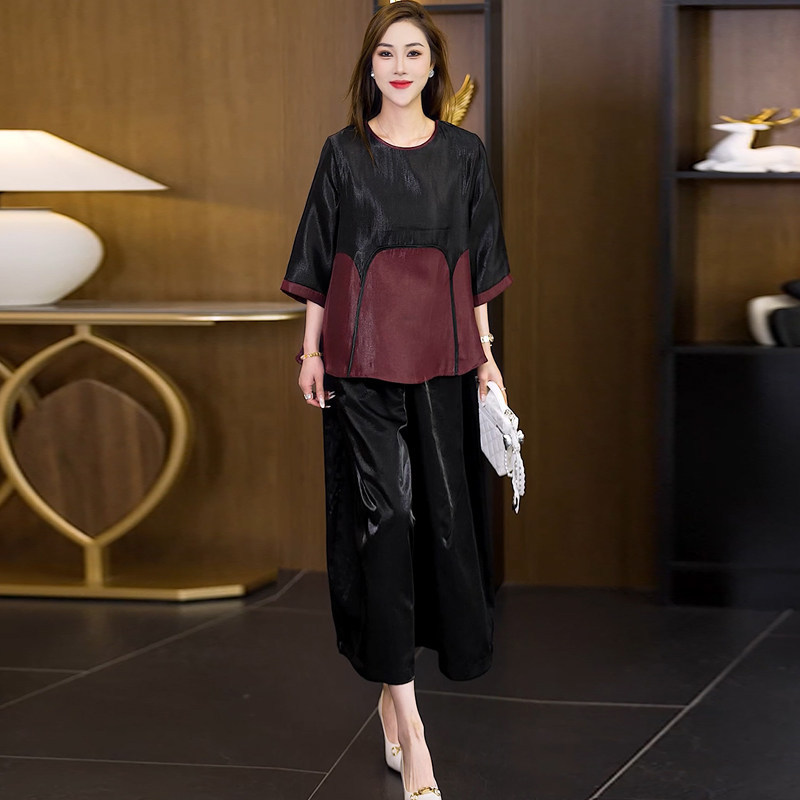 时尚 洋气撞色拼接香云纱上衣裙裤 两件套夏季 新款 潮 阔太太休闲套装