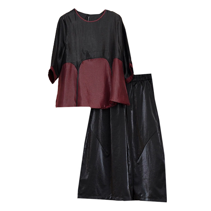 时尚 洋气撞色拼接香云纱上衣裙裤 两件套夏季 新款 潮 阔太太休闲套装由