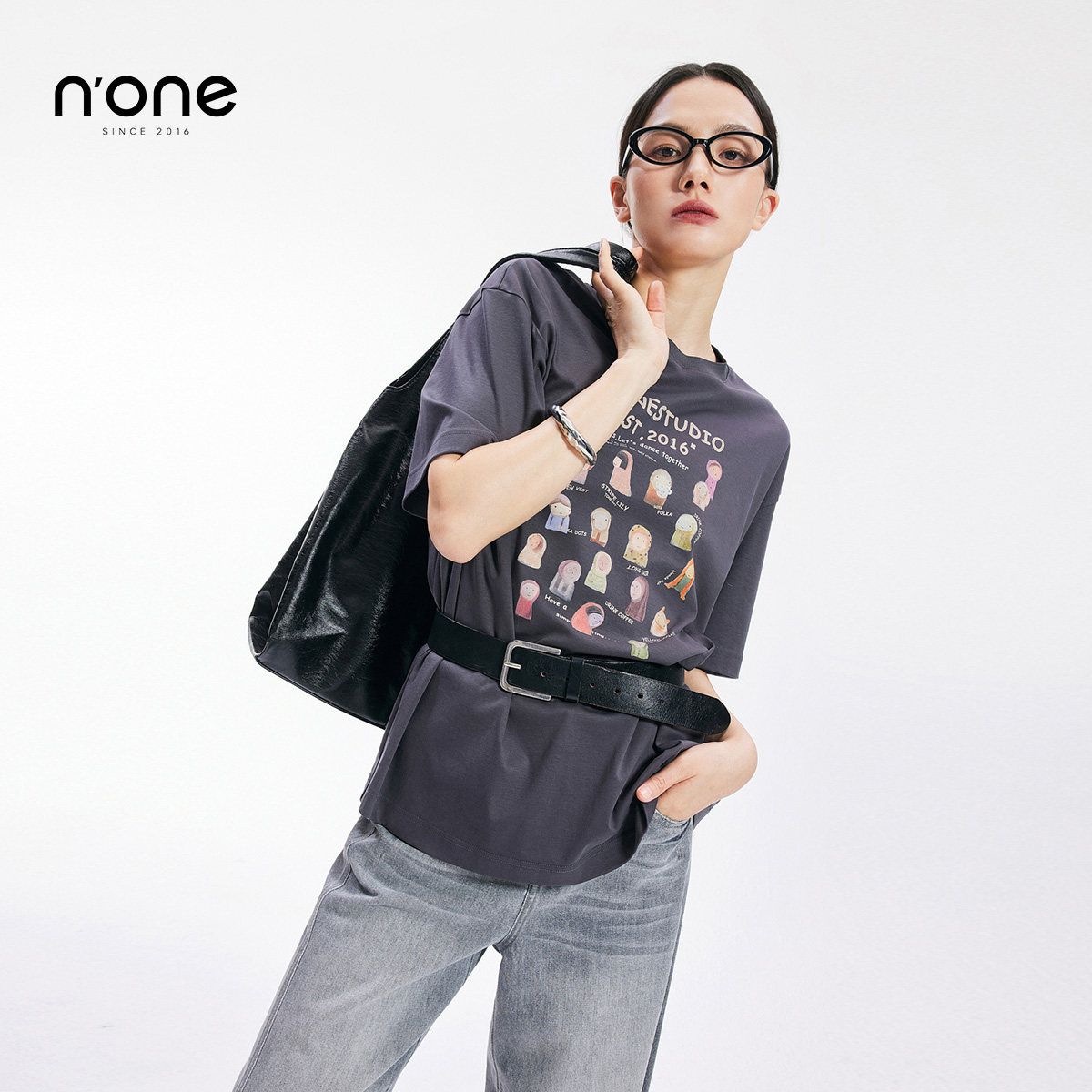 none 女士夏短袖 t恤宽松显瘦韩版 慵懒风卡通印花 100%纯棉2025新款