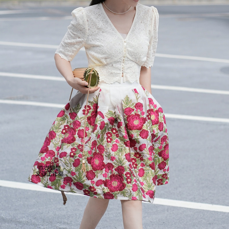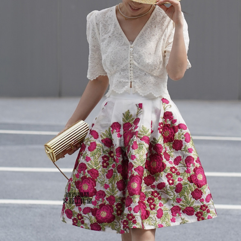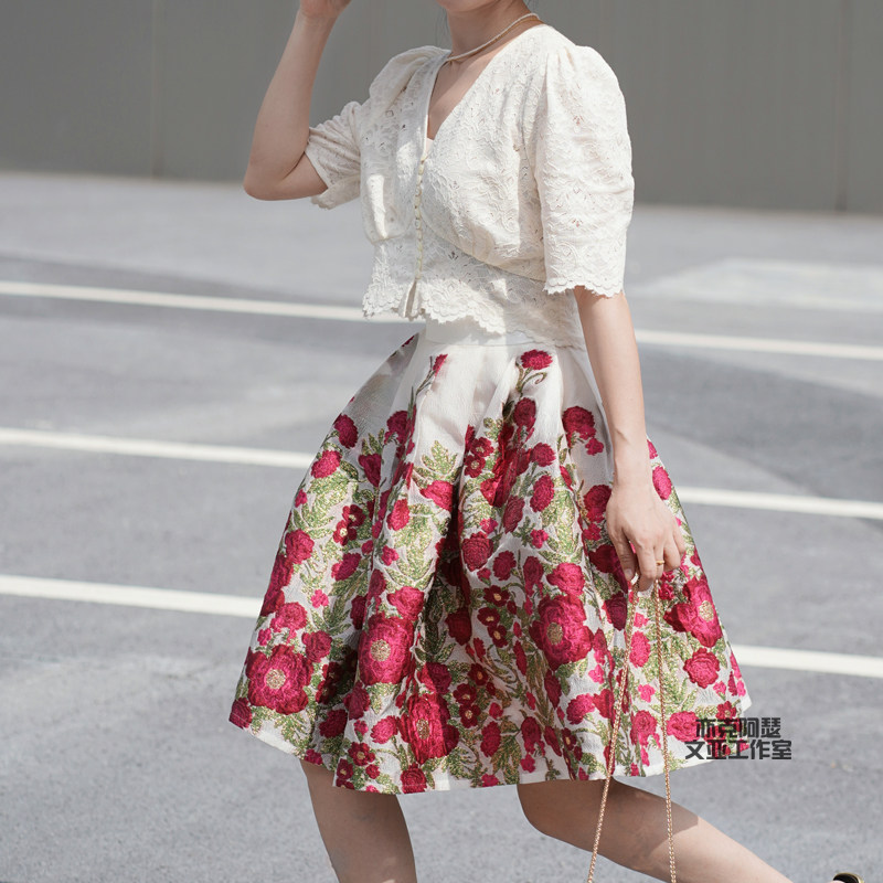 为您提供商品显瘦女 亦克阿瑟花朵提花半身裙优雅高腰a字伞裙复古百褶蓬蓬短款的详细介绍,