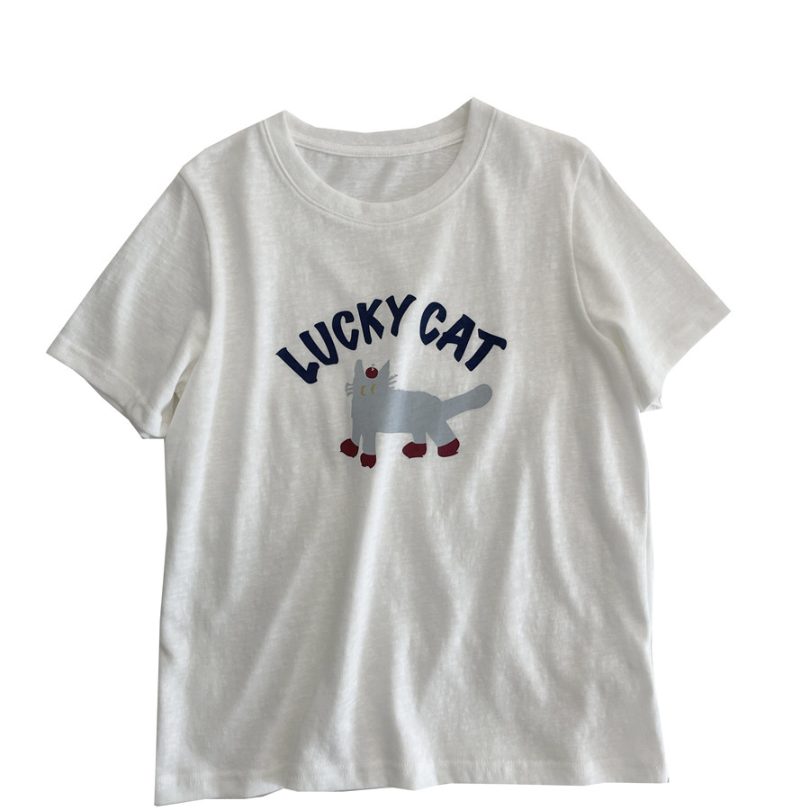 夏季 凉爽雪花棉小个子正肩显瘦圆领T t恤女 韩系卡通小猫印花短袖