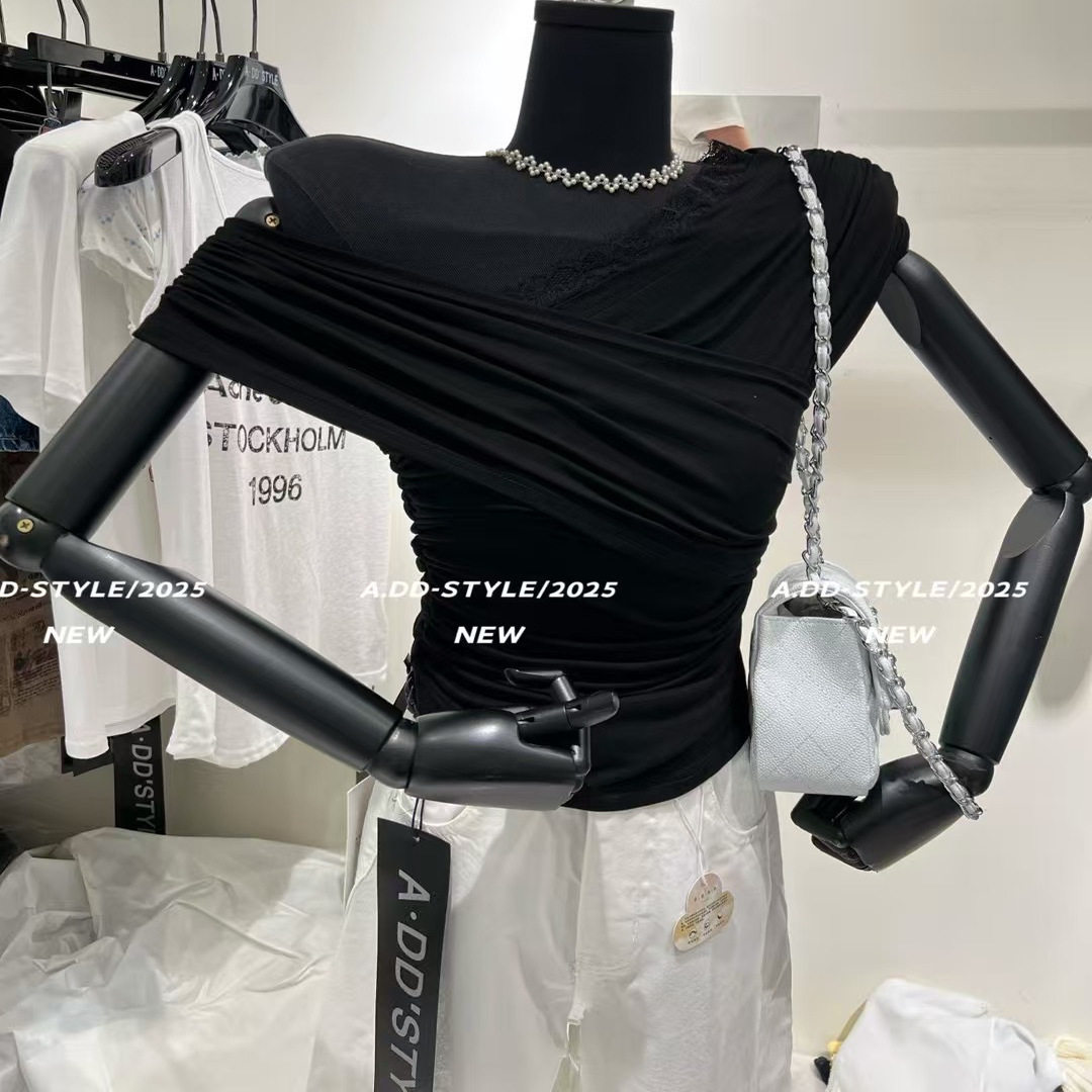 洋气紧身显瘦斜肩收腰褶皱设计感短袖 T恤 新款 ADD辣妹上衣2025夏季