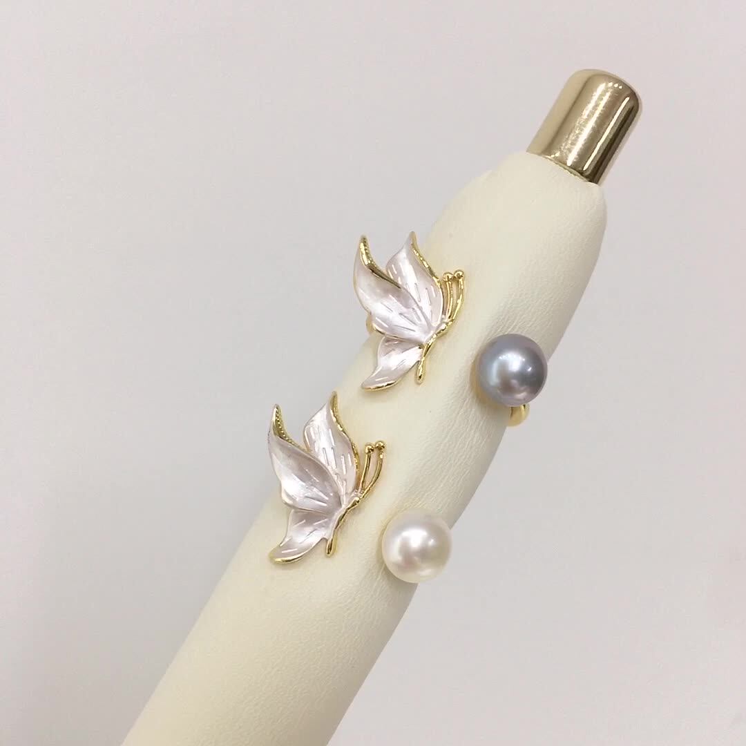 6A级高亮天然淡水真珍珠戒指女士18K包金磨砂蝴蝶珍珠指环开口由