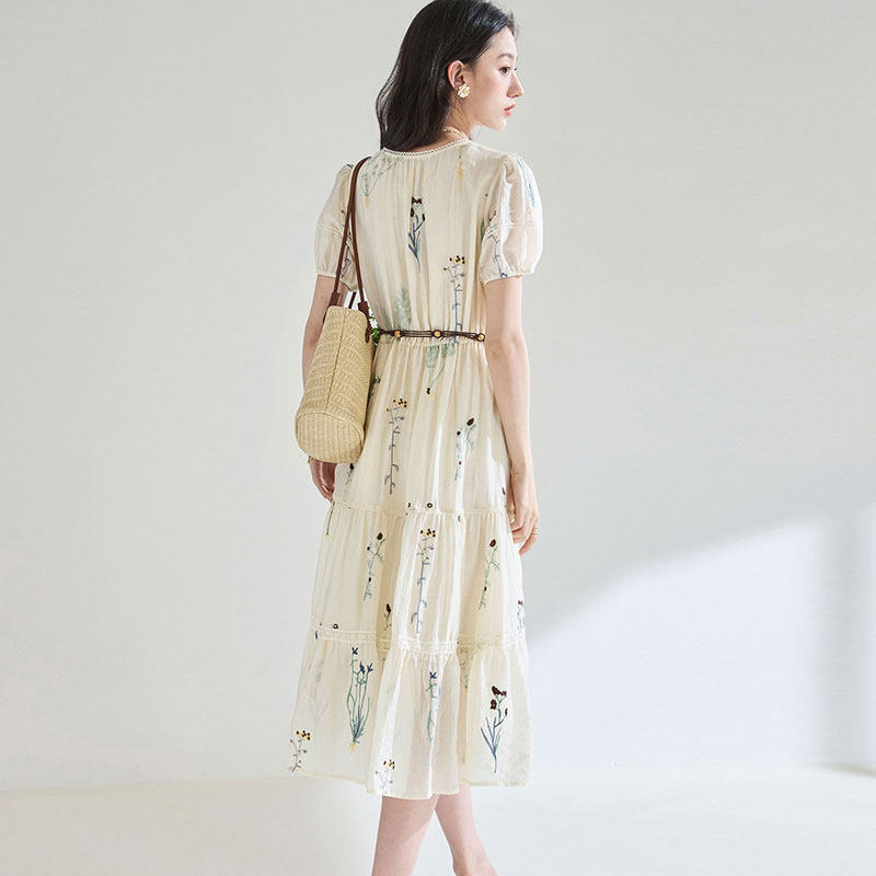 复古刺绣天丝短袖 中长裙气质度假风裙子 连衣裙女夏25新款 迪奥法式由